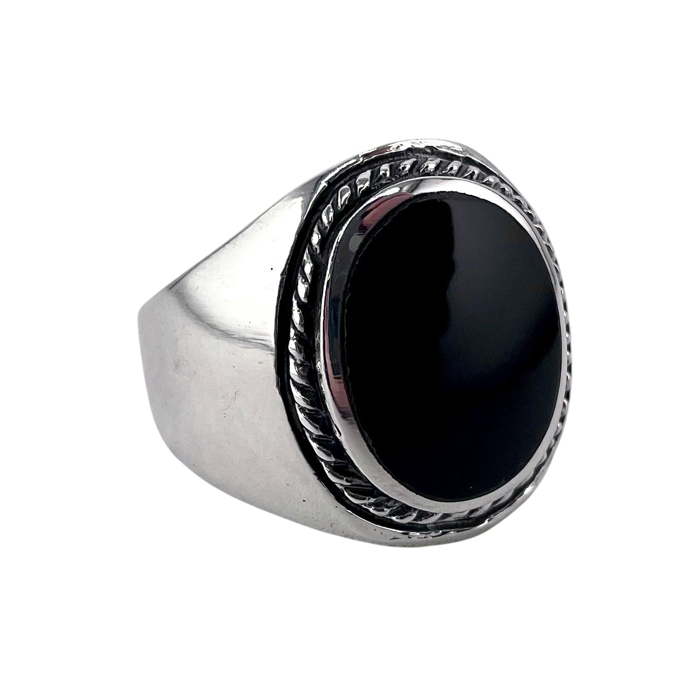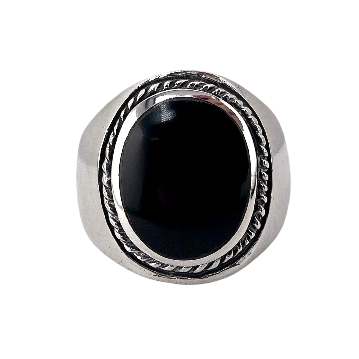 Black Onyx Stone Oval Rope Mens Ring Sterling Silver