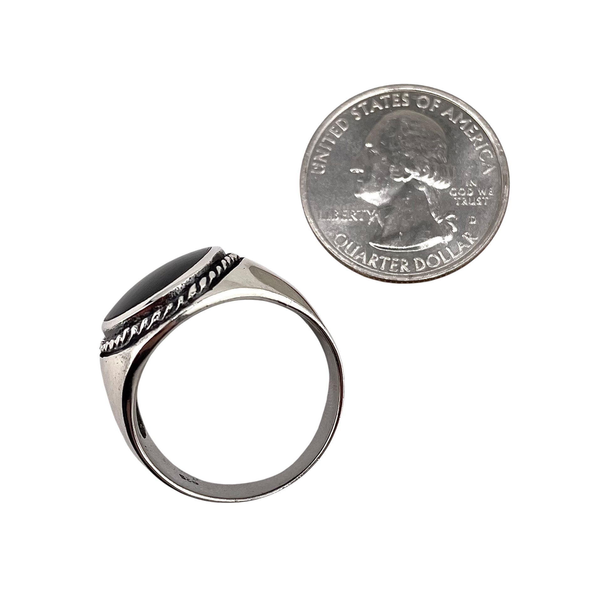Black Onyx Stone Oval Rope Mens Ring Sterling Silver. Ring measures 7/8" wide and is available in sizes 9-12.