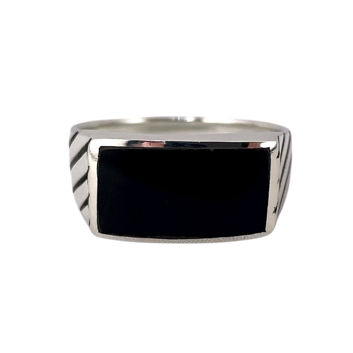 Black Onyx Stone Rectangle Mens Ring Sterling Silver. Ring measures 3/8" wide and is available in sizes 9-12.