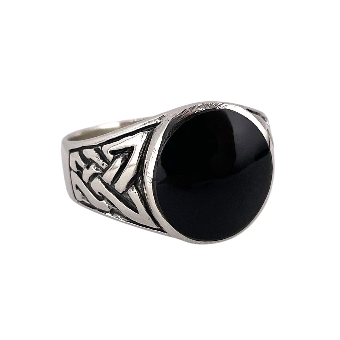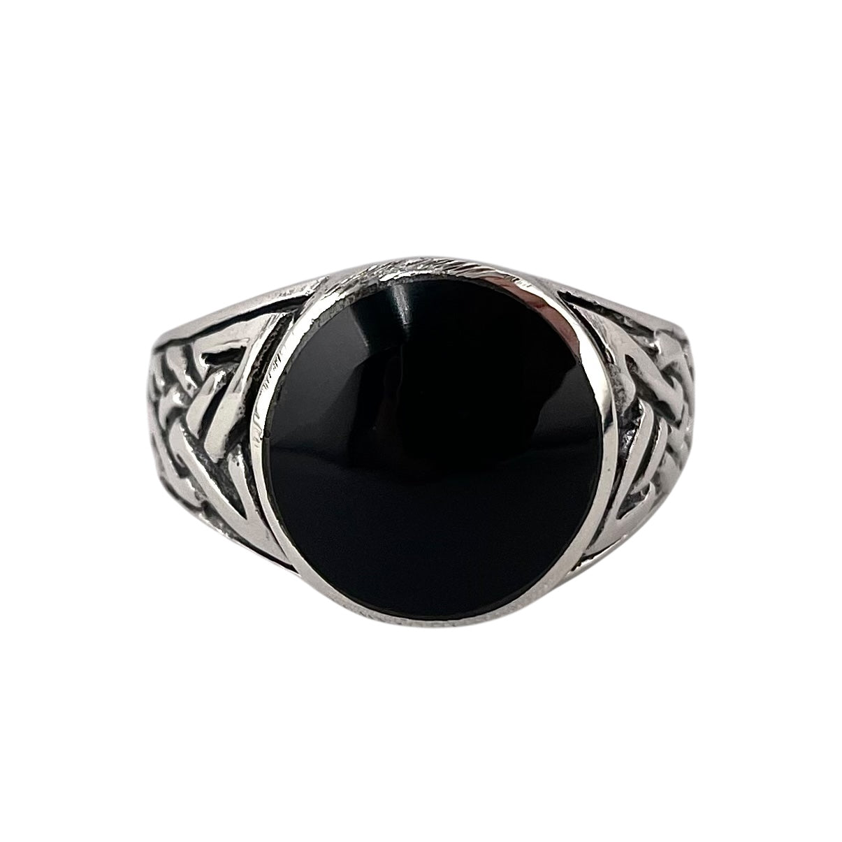 Black Onyx Stone Round Mens Ring Sterling Silver. Ring measures 1/2" wide and is available in sizes 9-12.