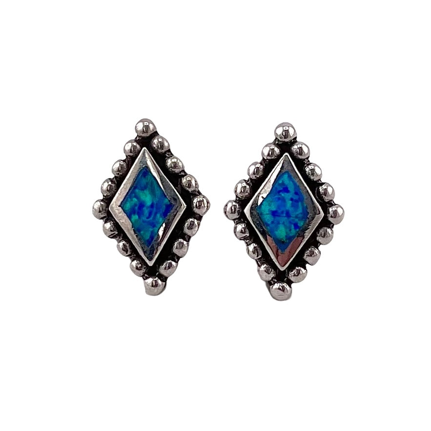 Blue Lab Opal 13mm Dotted Diamond Stud Earrings Sterling Silver. Measurements of these earrings are 1/2" long and 3/8" wide.