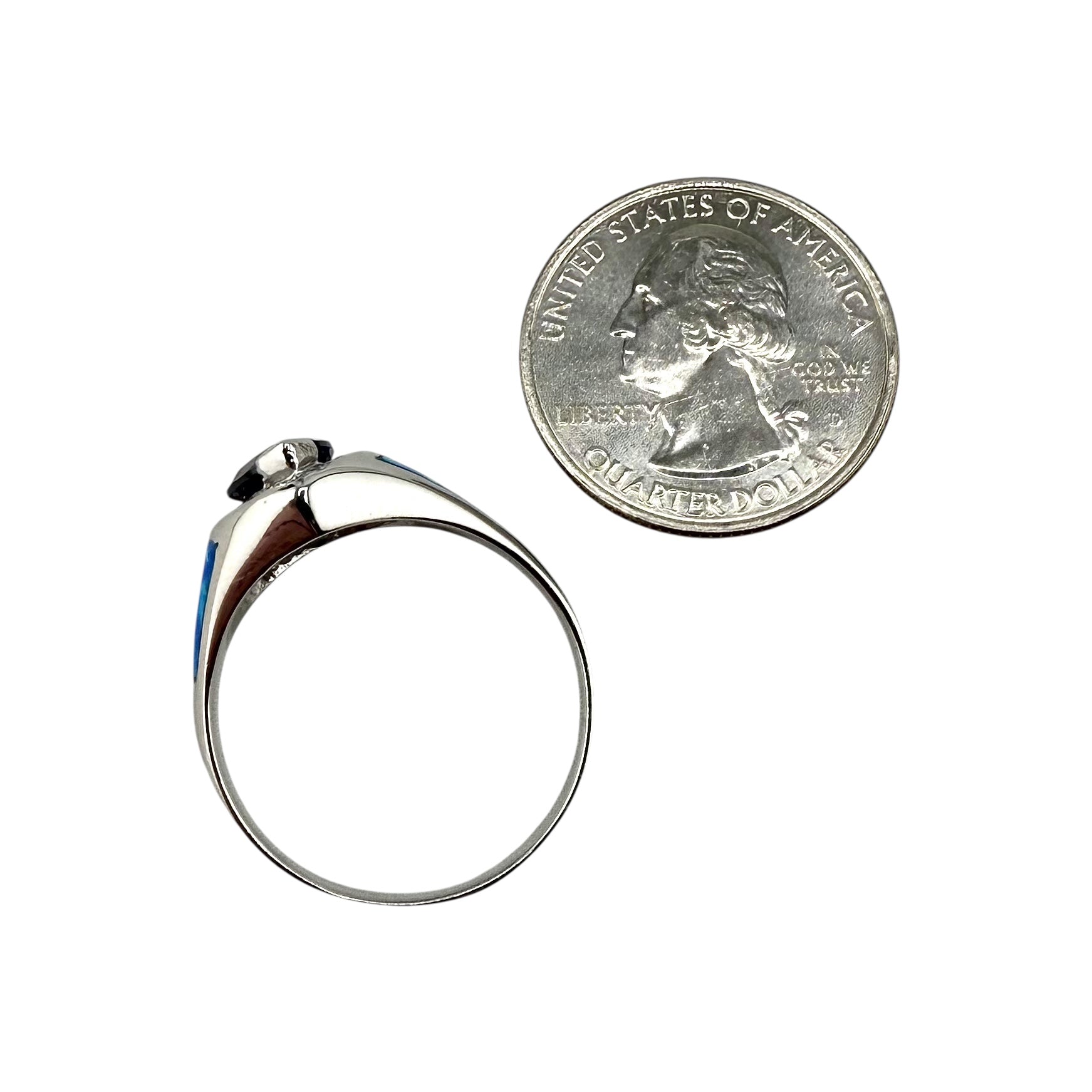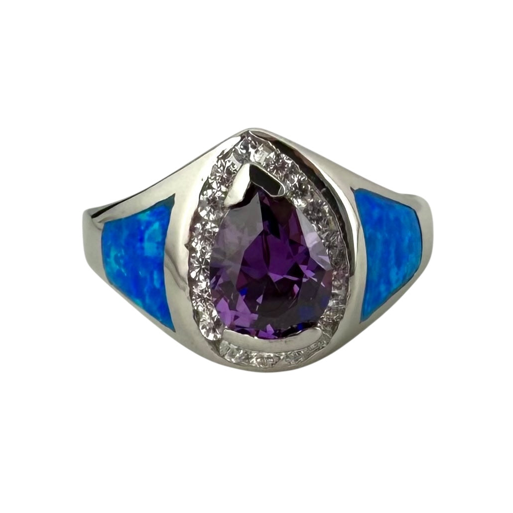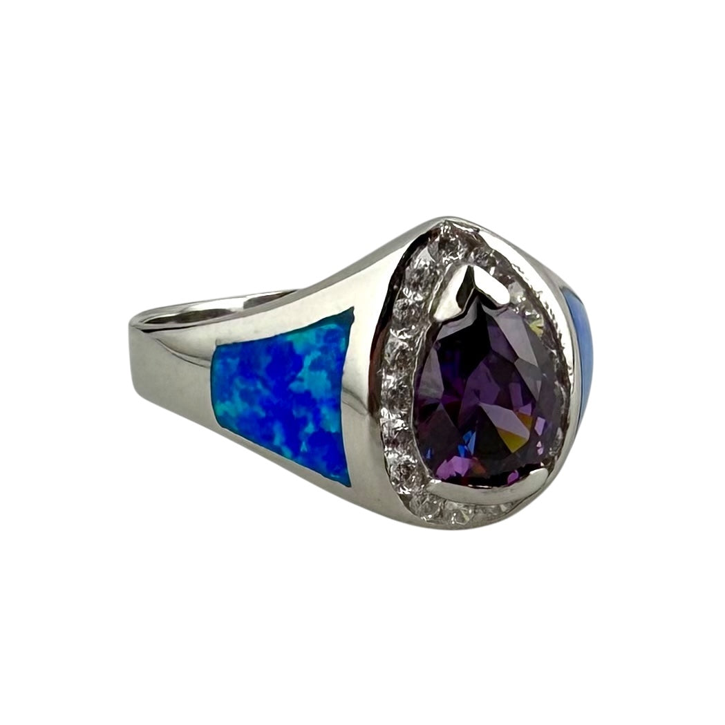 Blue Lab Opal Pear Purple Amethyst & CZ Diamond Ring Sterling Silver. This ring measures 14mm wide and is available in sizes 7-11.