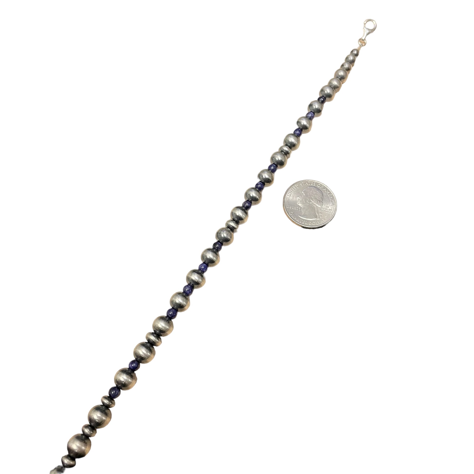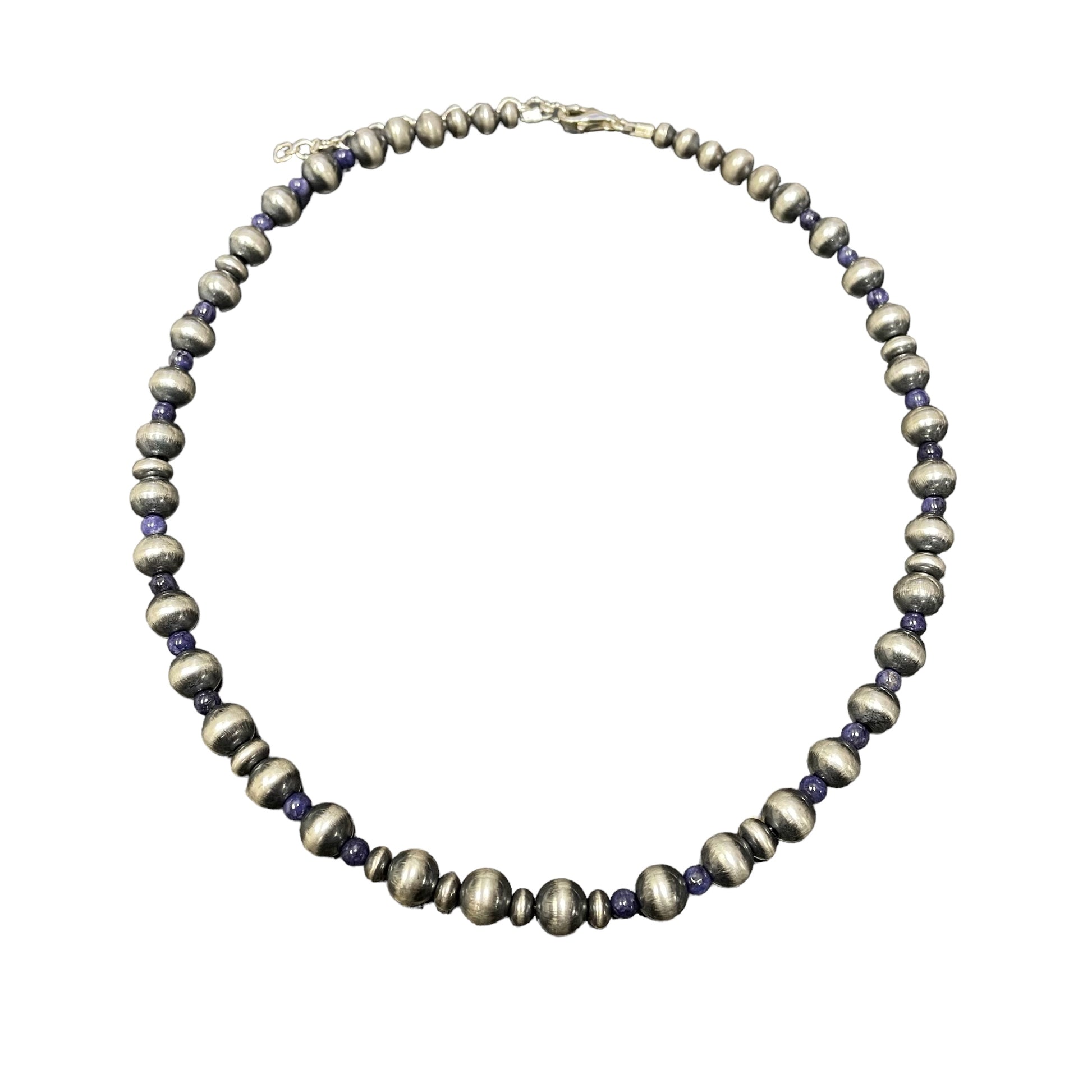 Necklace is 18" long with a 3" extender and mixed silver beads. It is 1/4" at the widest point.