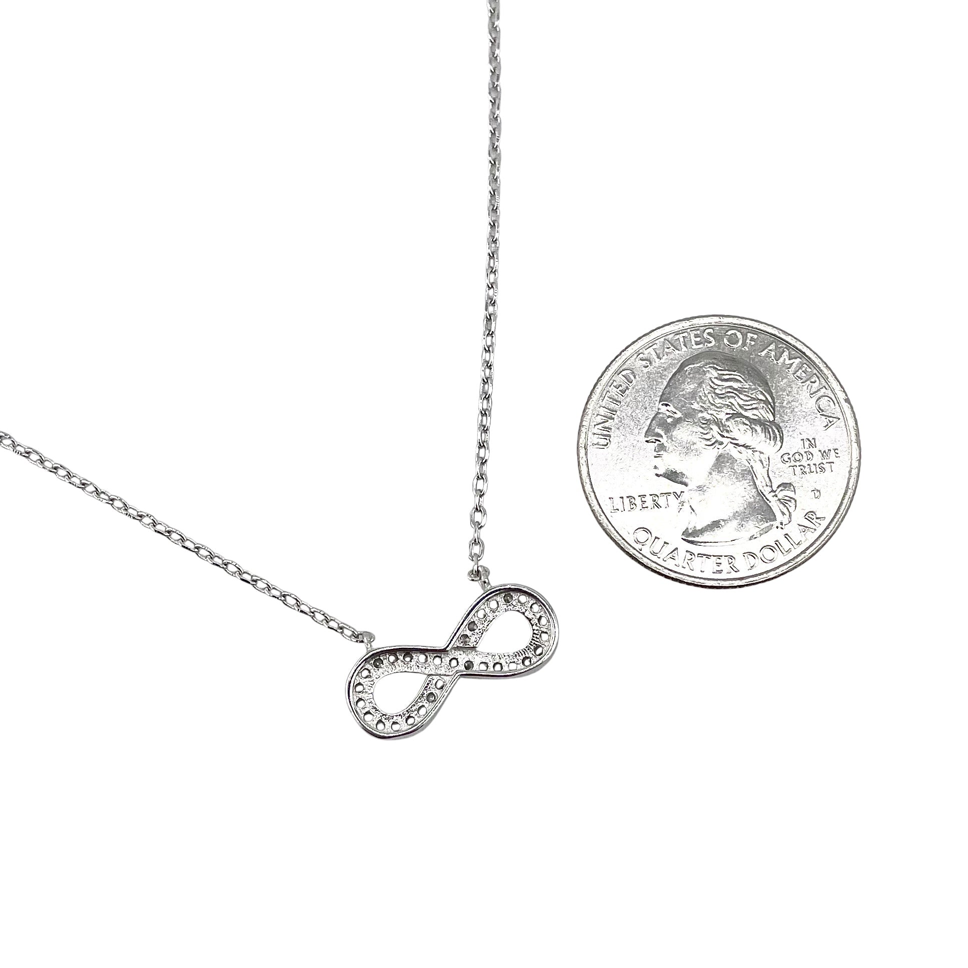 CZ Infinity Chain Necklace Sterling Silver. This necklace measures 17" long, plus a 1.5" extender. The pendant is approximately 3/8" long and 3/4" wide.