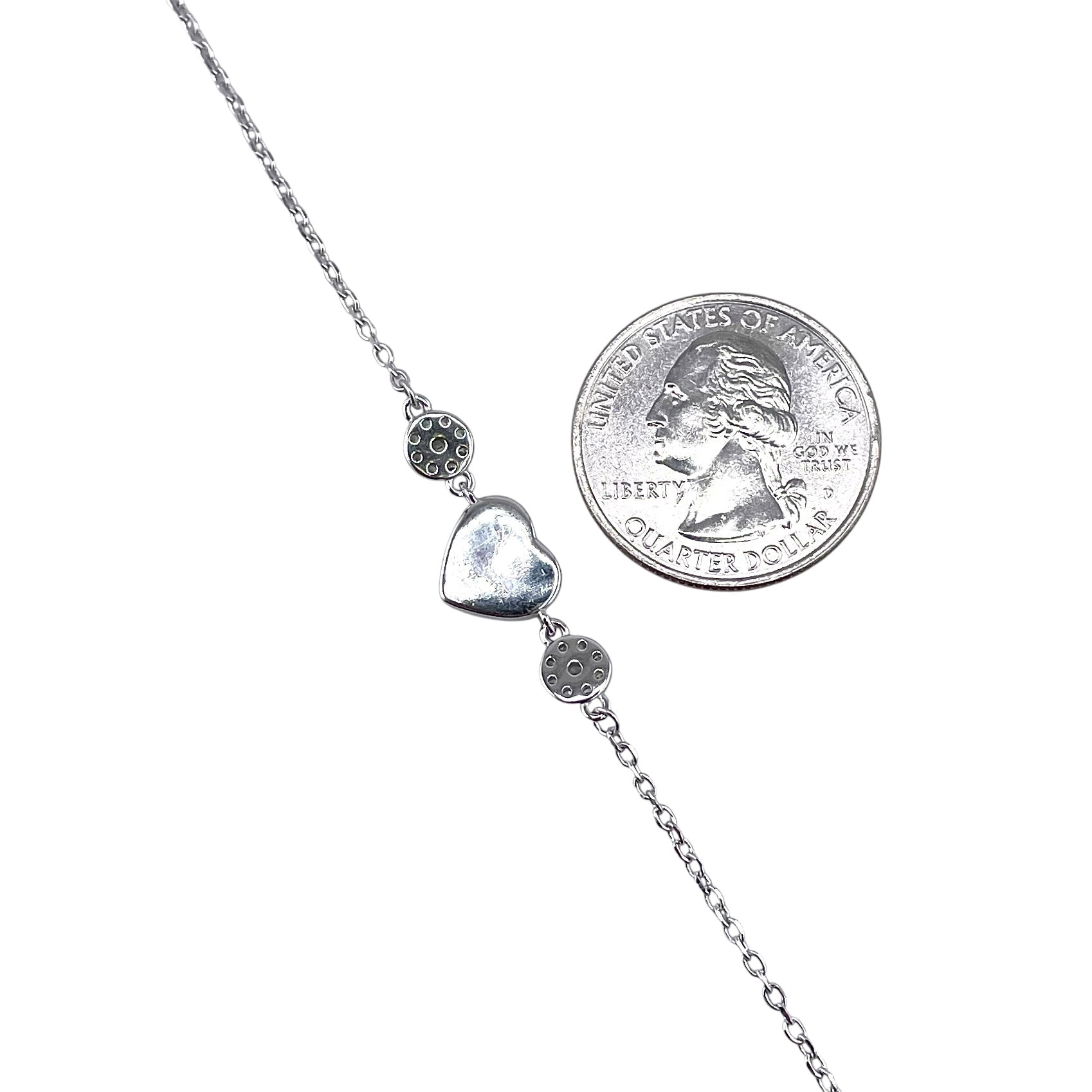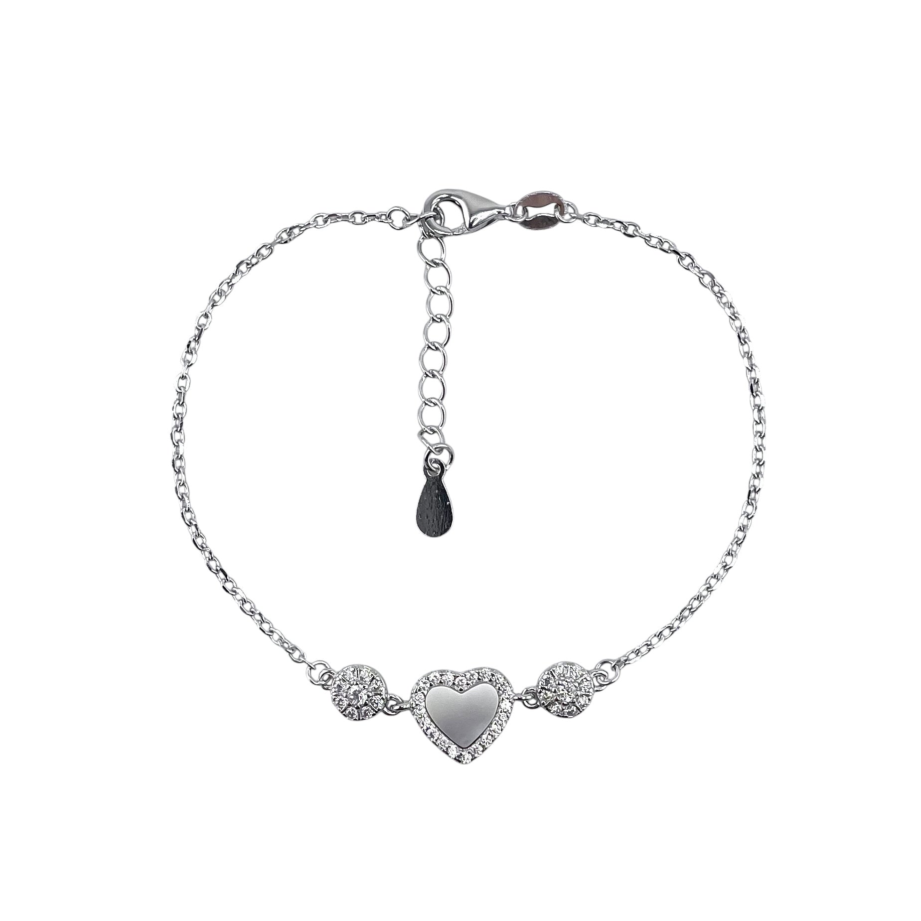 CZ Mother of Pearl Heart Round Link Bracelet Sterling Silver. Measurements of this bracelet is 7" long with a 1.5" extender. The centerpiece is 9mm in width.