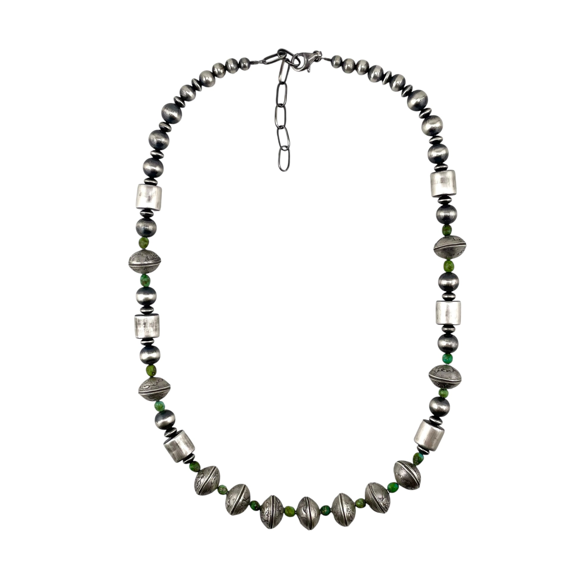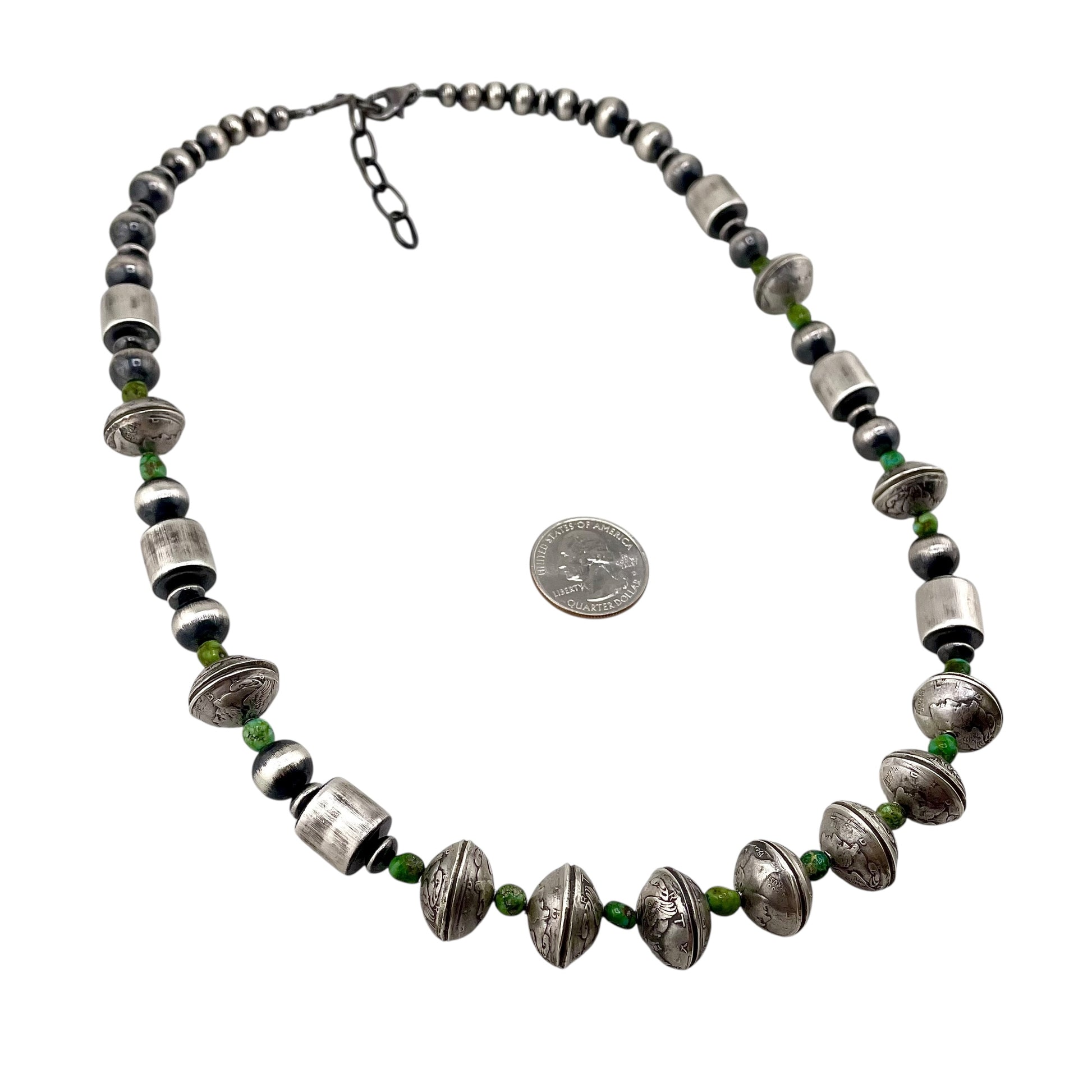 Necklace is 27" long with Desert Pearl Silver Beads, Turquoise, & Mercury Dime Beads. It is 16mm at the widest point.