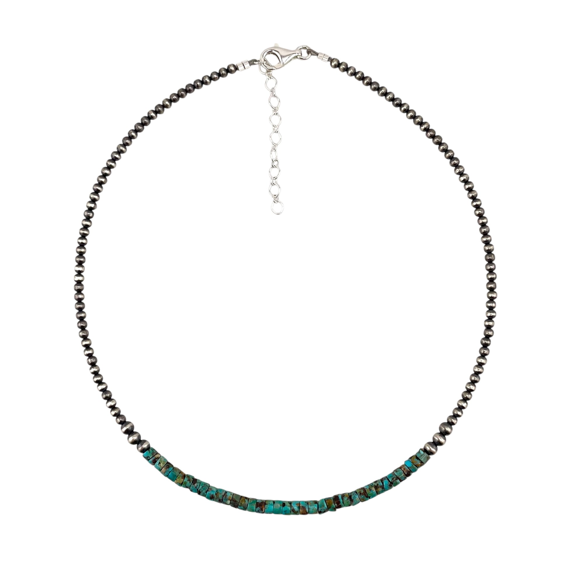 Turquoise Desert Pearl Necklace Sterling Silver. It is 16" long with a 2" extender and 4mm wide at the widest point.