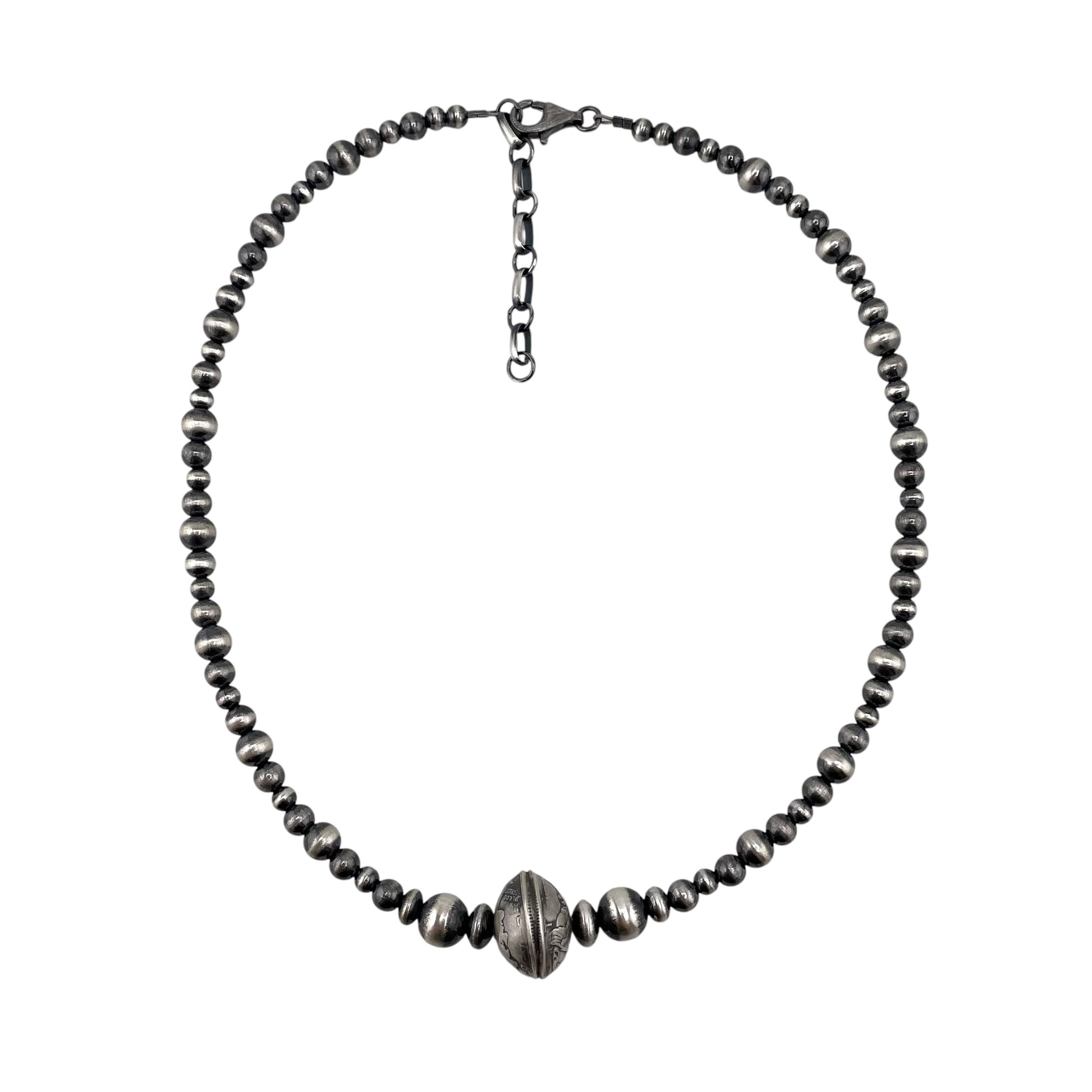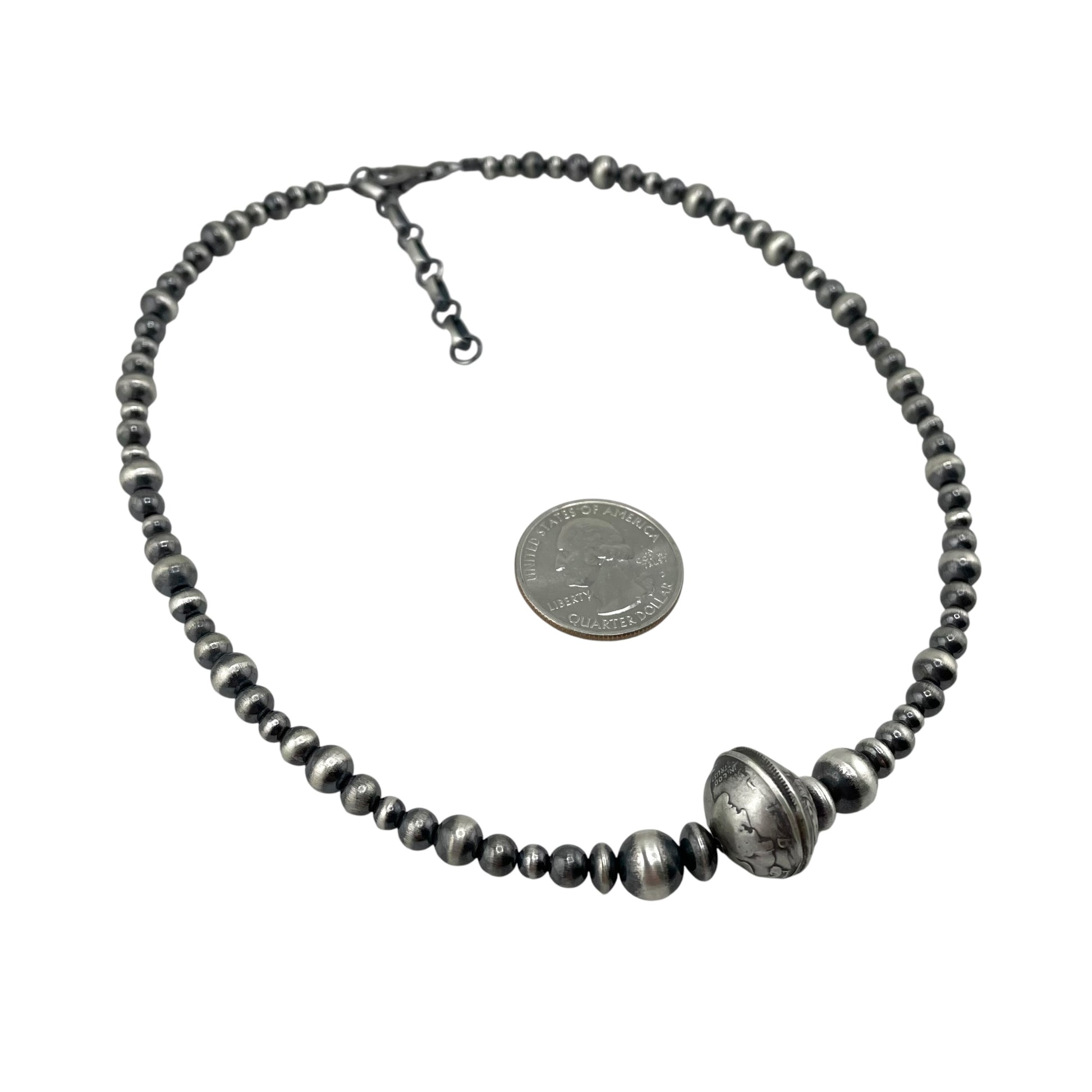 Necklace is 16" + 2" long with Desert Pearl Silver Beads & Mercury Dime Beads. It is 16mm at the widest point.