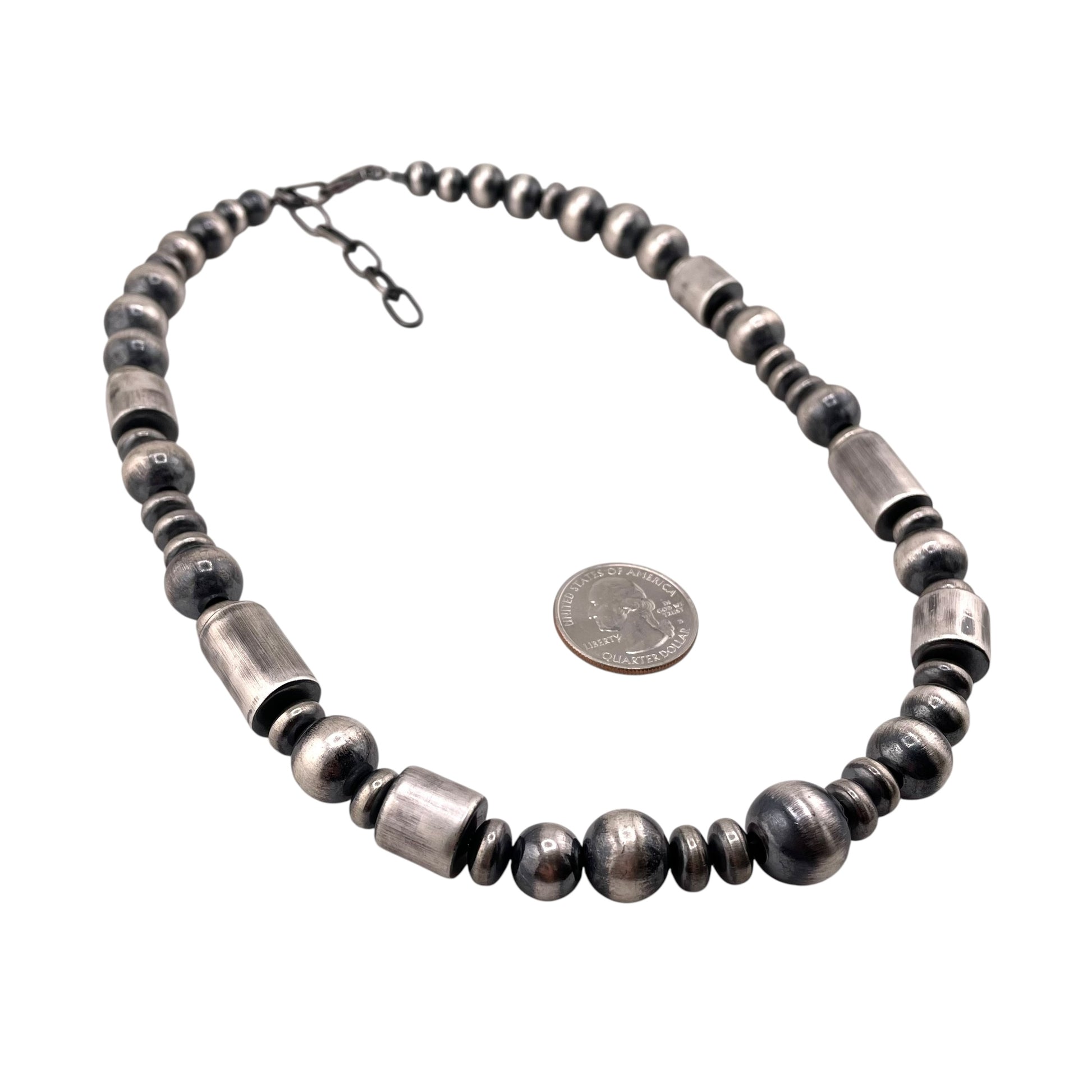 Necklace is 20" long with 3" extender Desert Pearl Sterling Silver Round, Saucer, & Cylinder Beads. It is 14mm at the widest point.