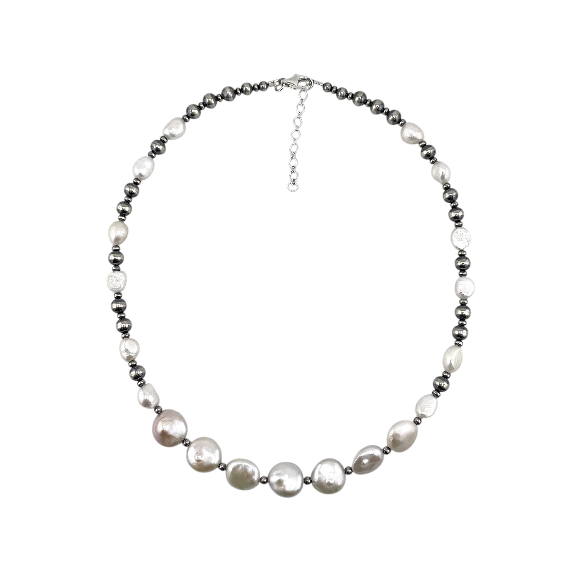Desert Pearls & White Pearls Coin Bead Necklace Sterling Silver