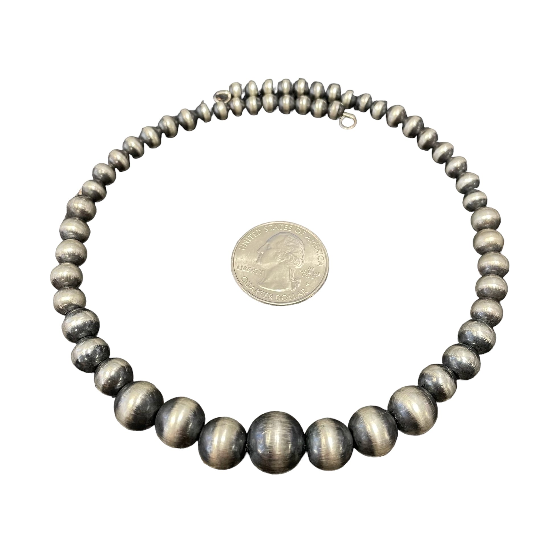Necklace is 13" long with graduated silver beads. It is 1/2" at the widest point.