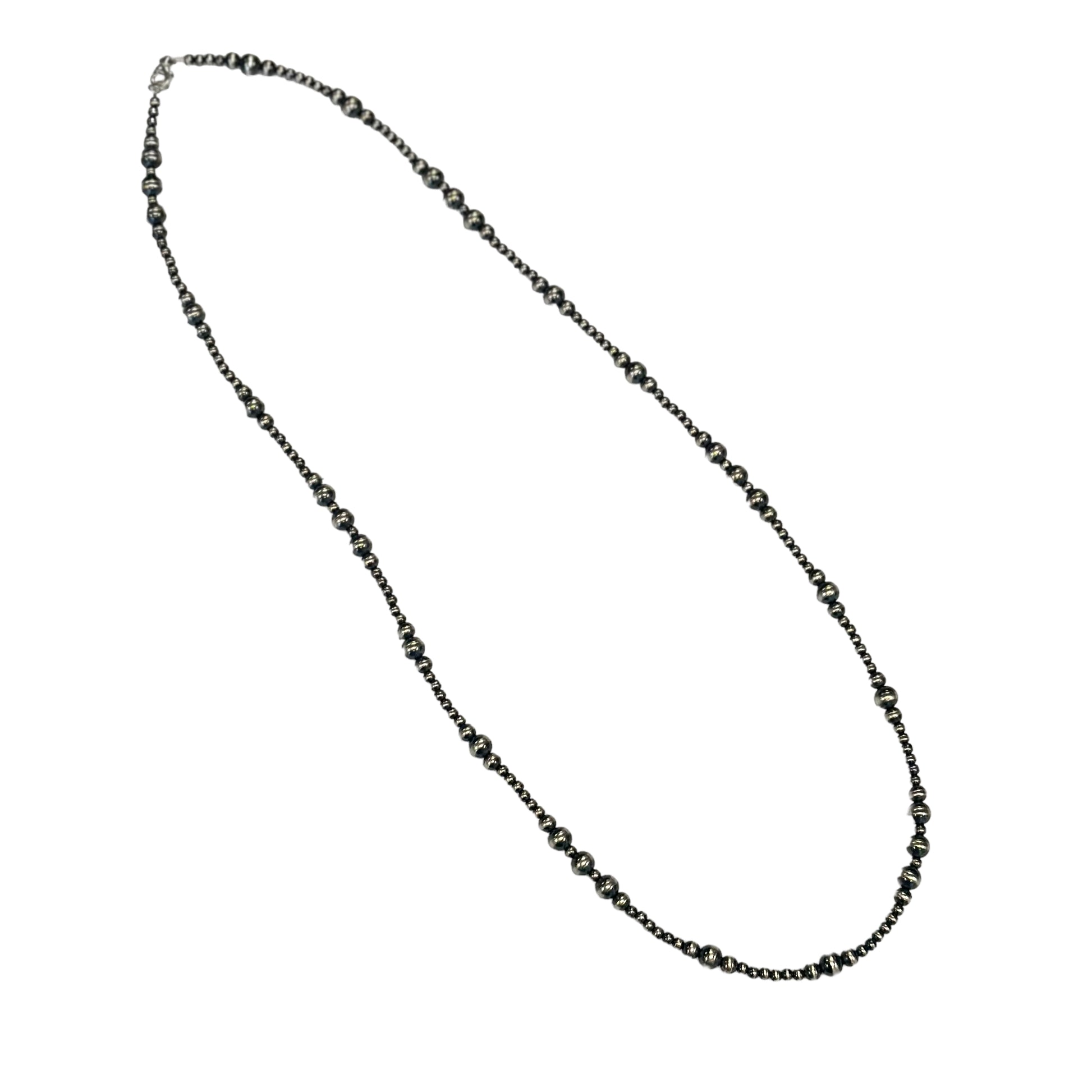 Necklace is designed with mixed silver beads. It is 5/16" at the widest point. Available in 36", 48", and 60"