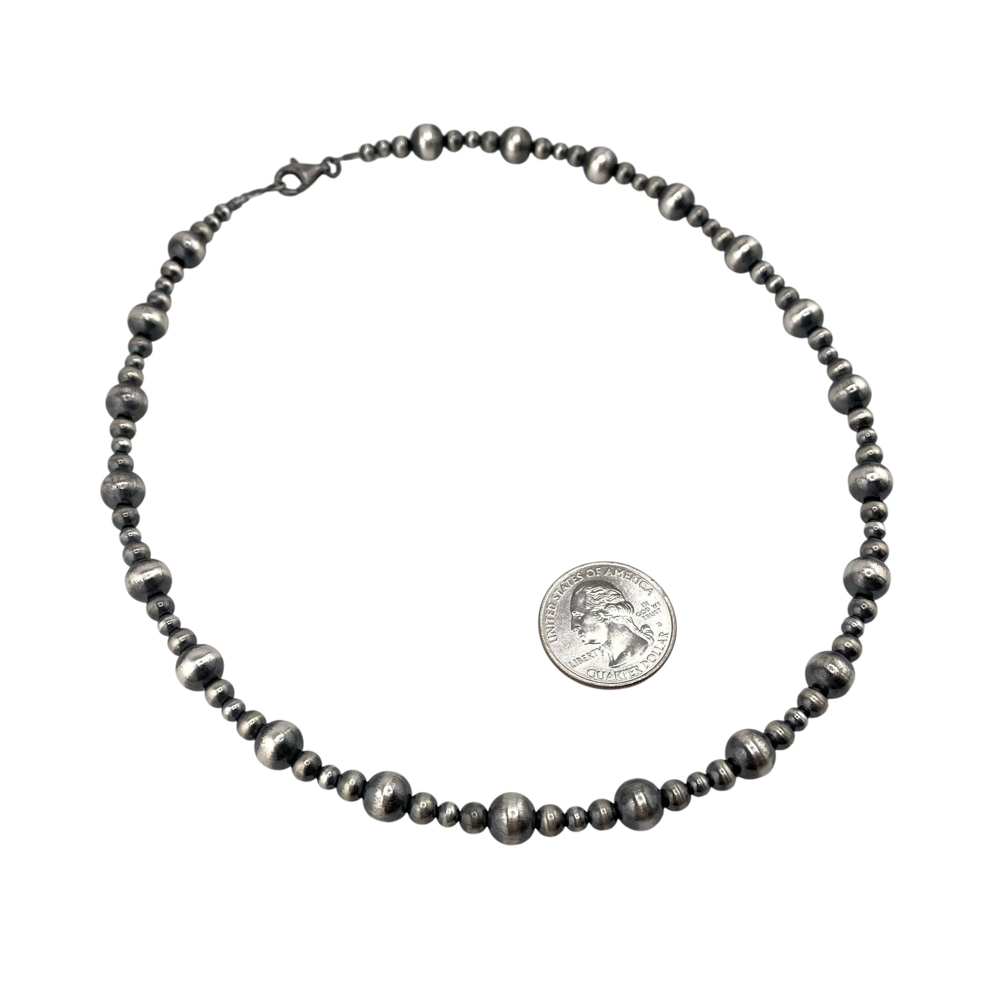 Necklace is 18" long with mixed silver beads. It is 5/16" at the widest point.