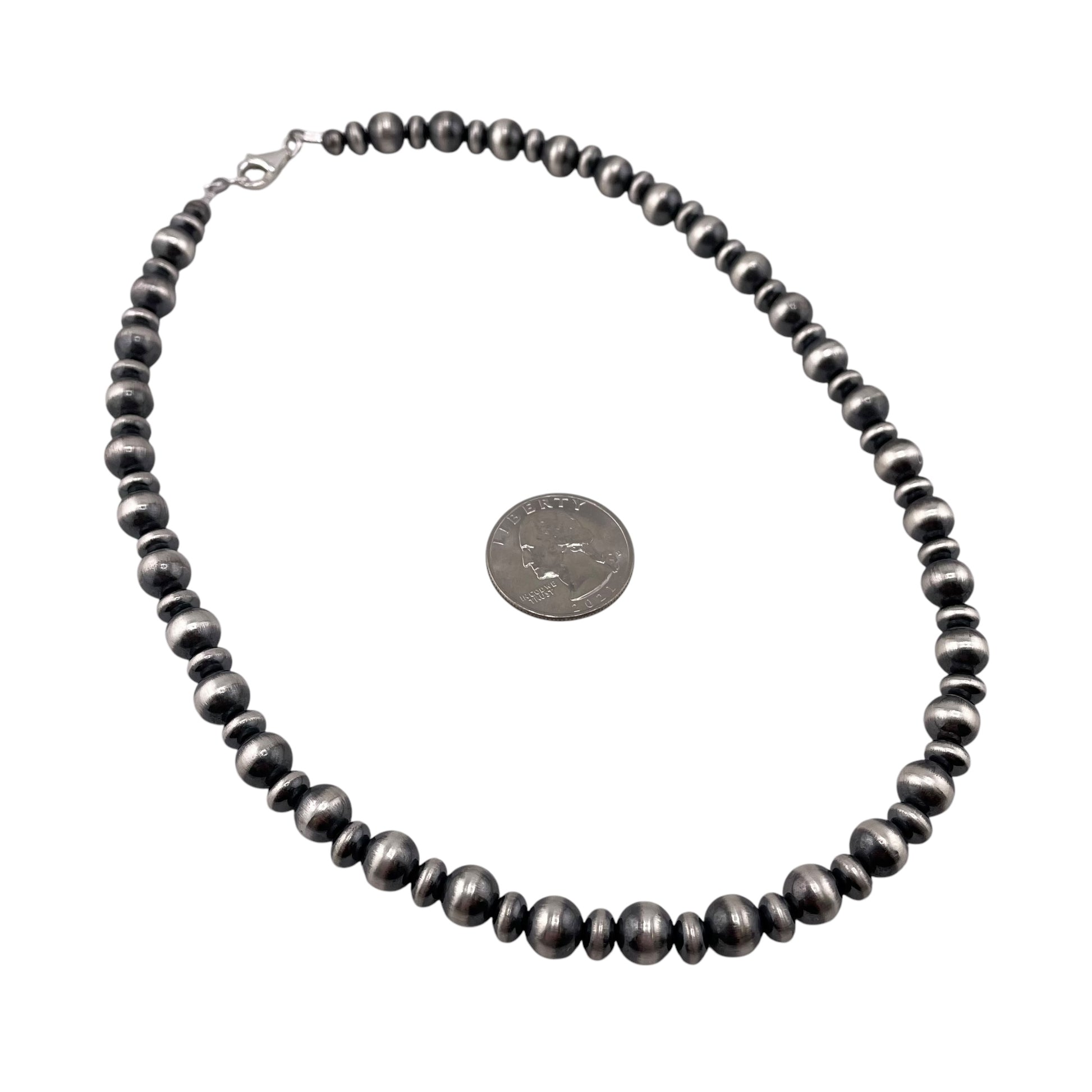 Necklace is 18" long with mixed silver beads. It is 8mm at the widest point.