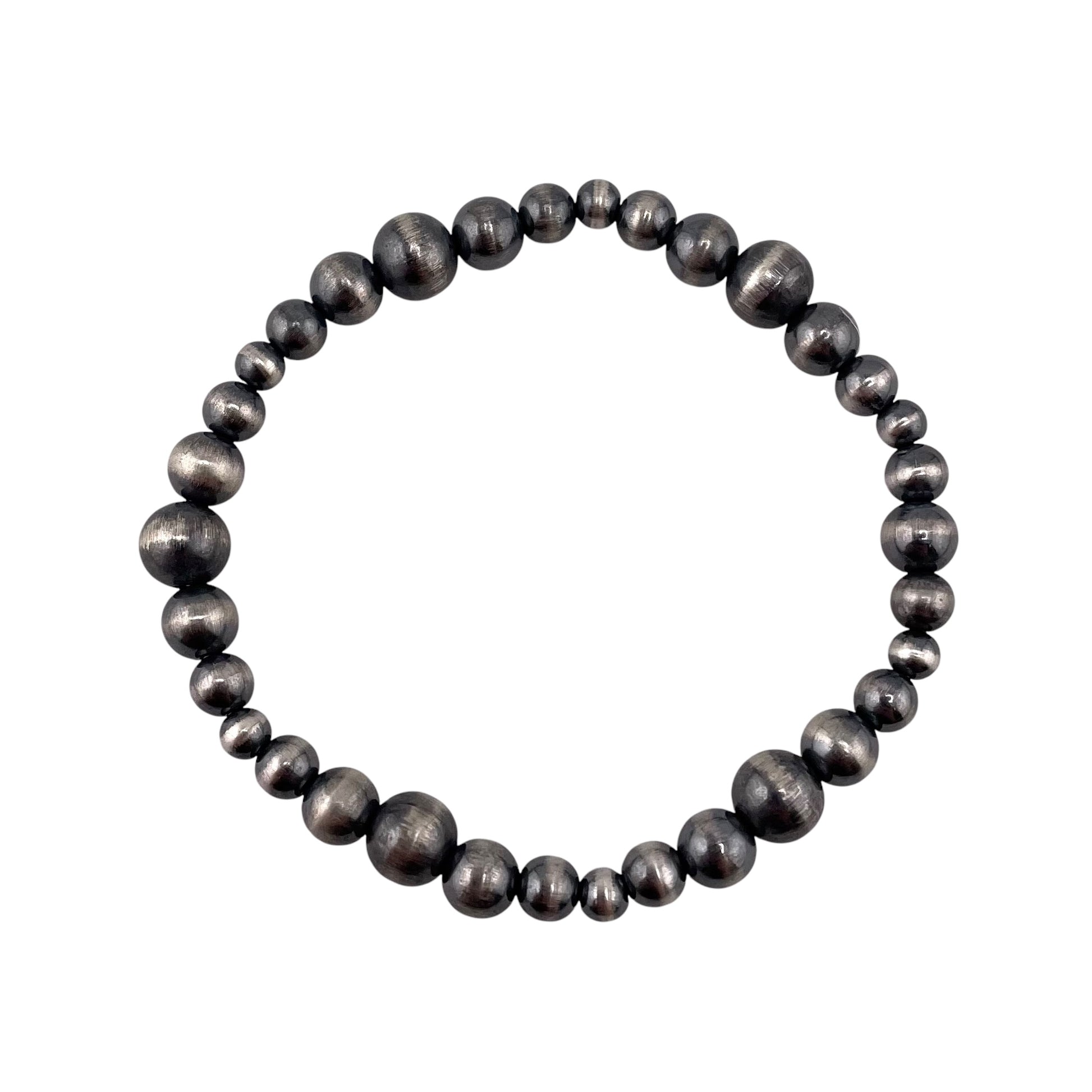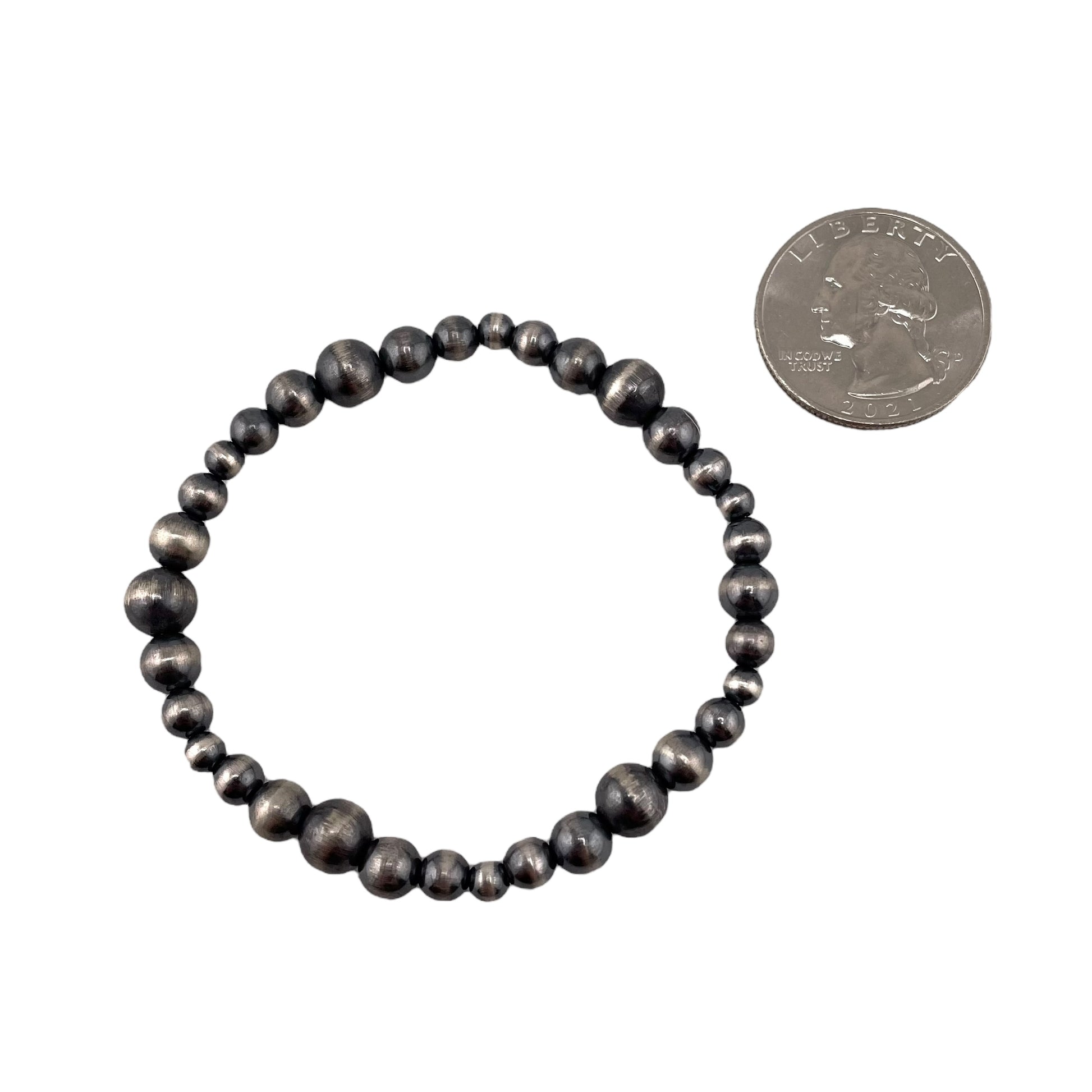 Navajo Pearl Oxidized Bead Stretch Bracelet Sterling Silver. Also known as Santa Fe Pearls or Desert Pearls. This bracelet is a one-size-fits-all stretch bracelet. It is 7mm at the widest point.