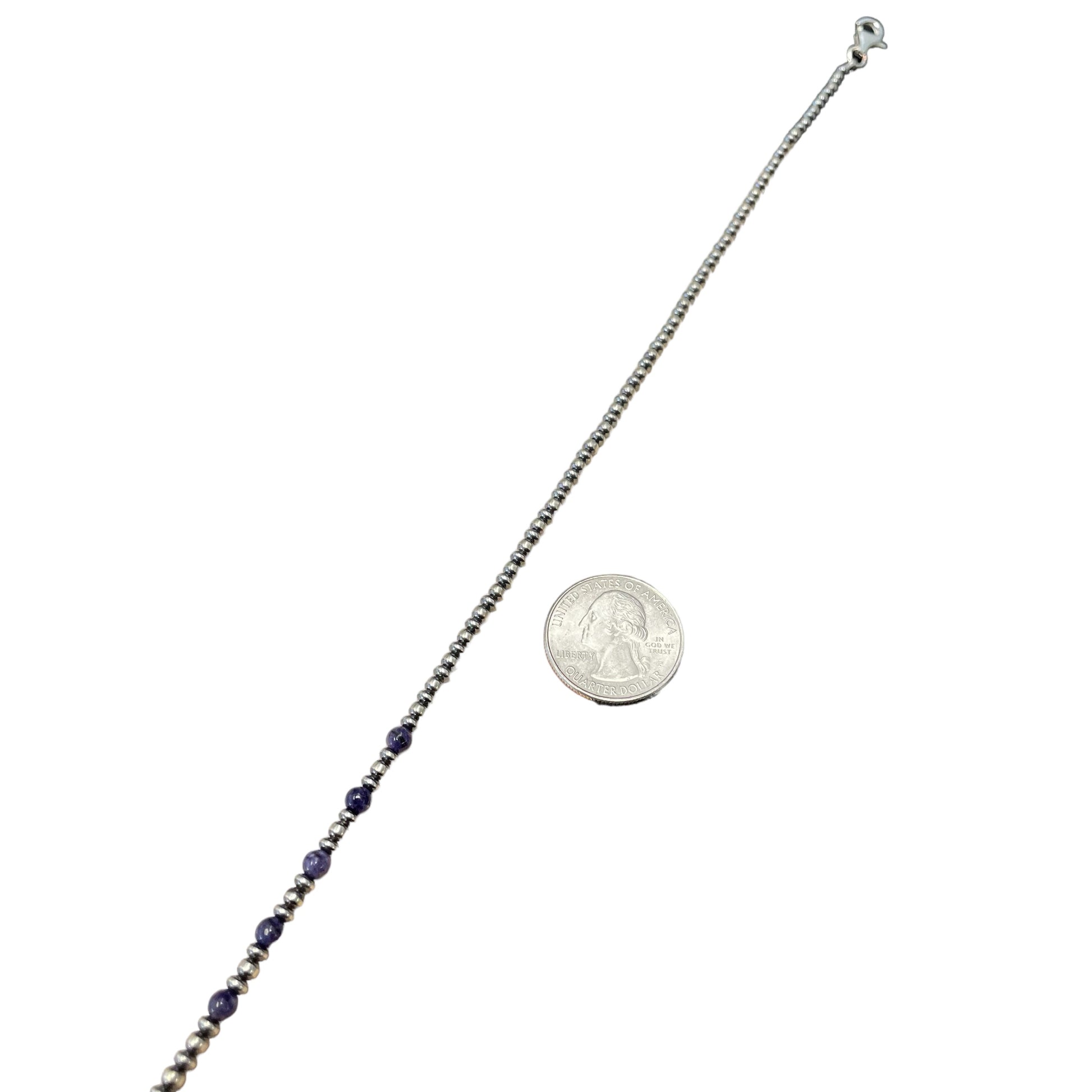 Necklace is available in 14" or 18" long with 2" extender and mixed silver beads. It is 3/16" at the widest point.