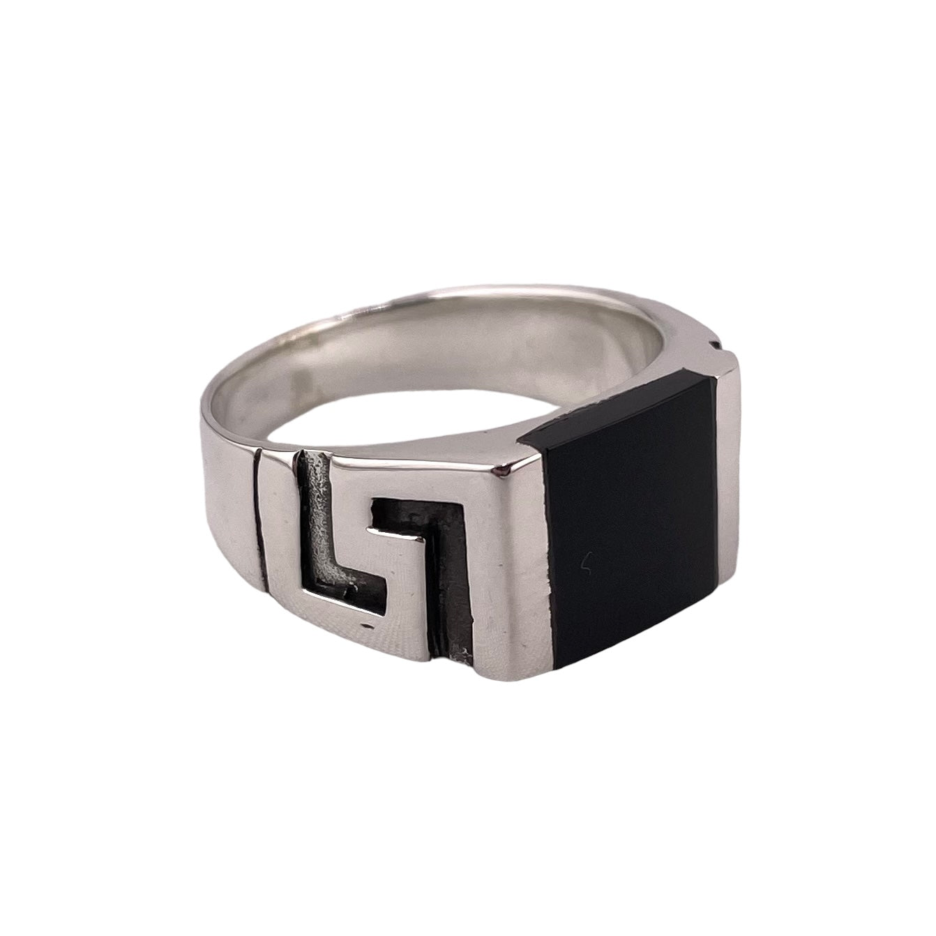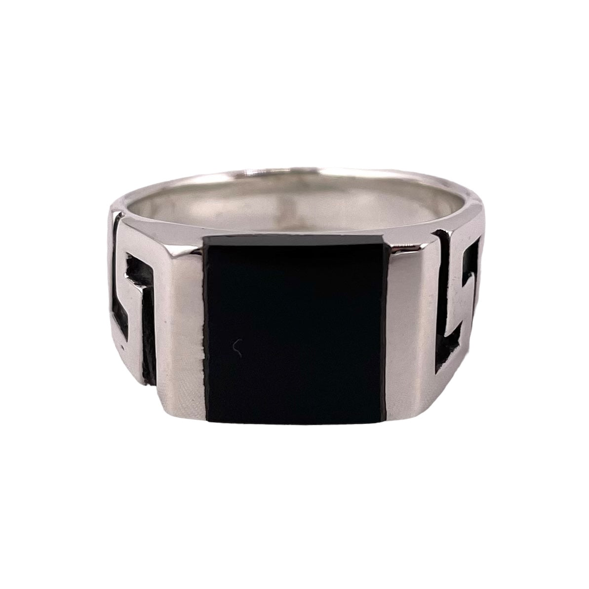 Black Onyx Square Stone Greek Key Mens Ring Sterling Silver