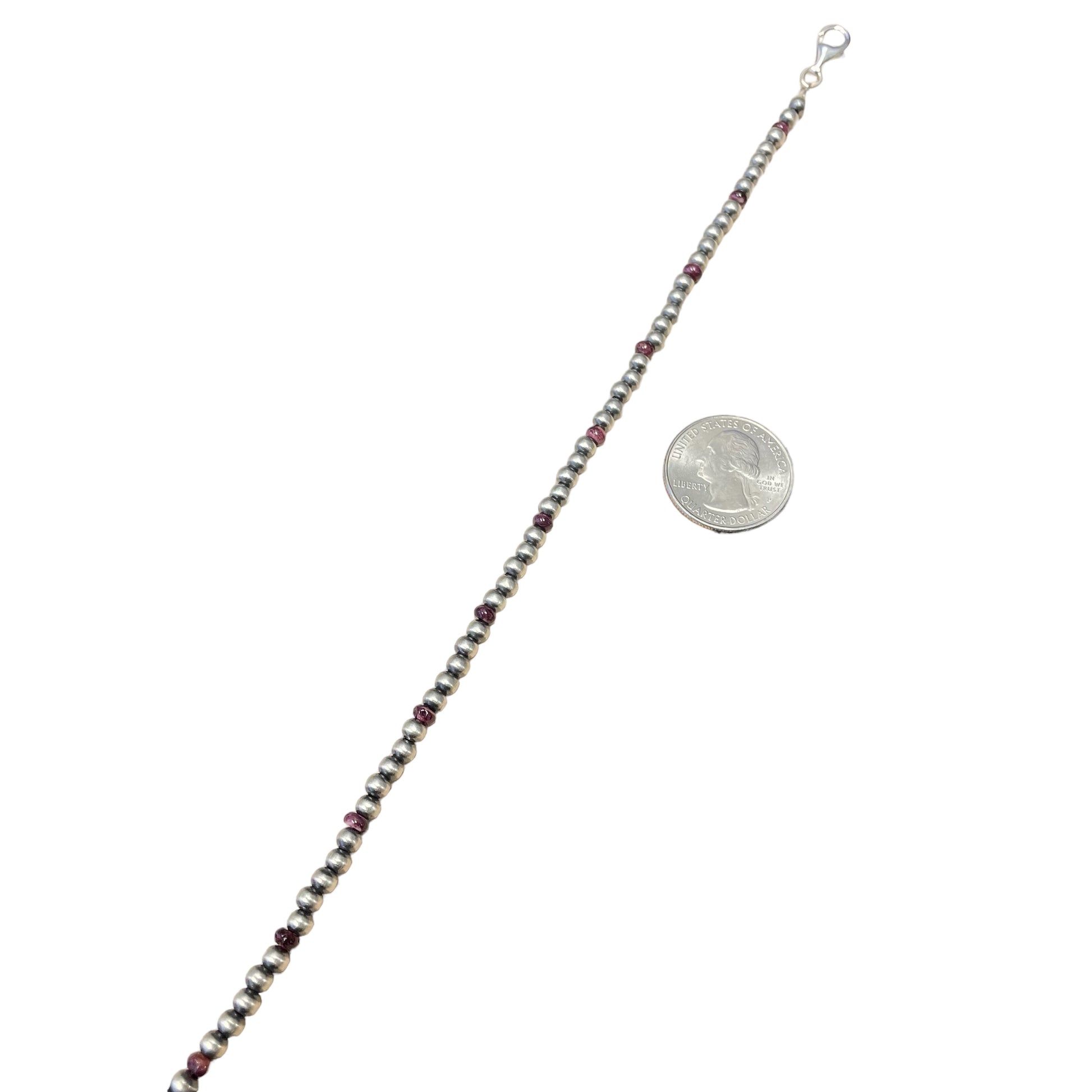Necklace is 18" long with a 2.5" extender and 4mm silver beads. It is 1/8" wide.