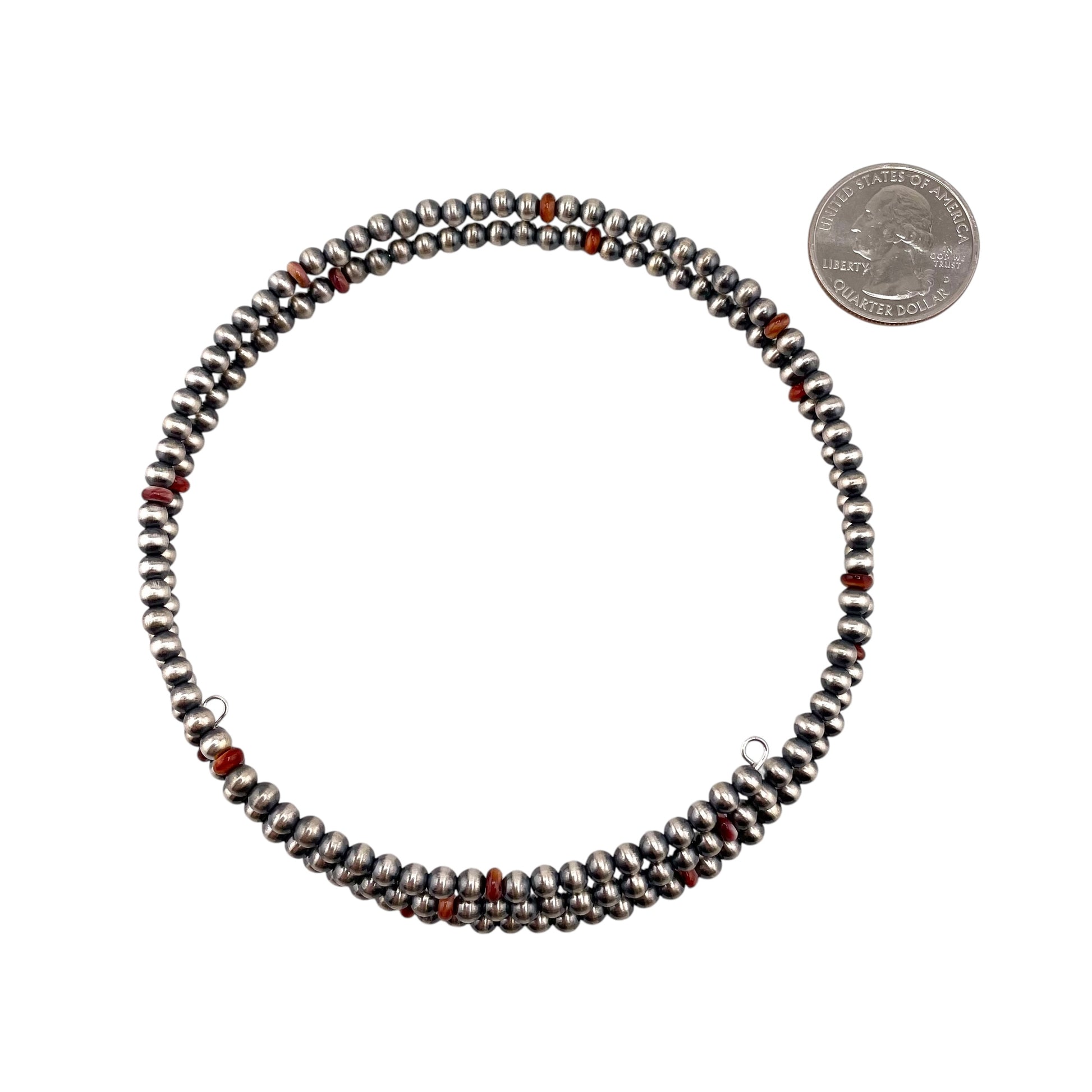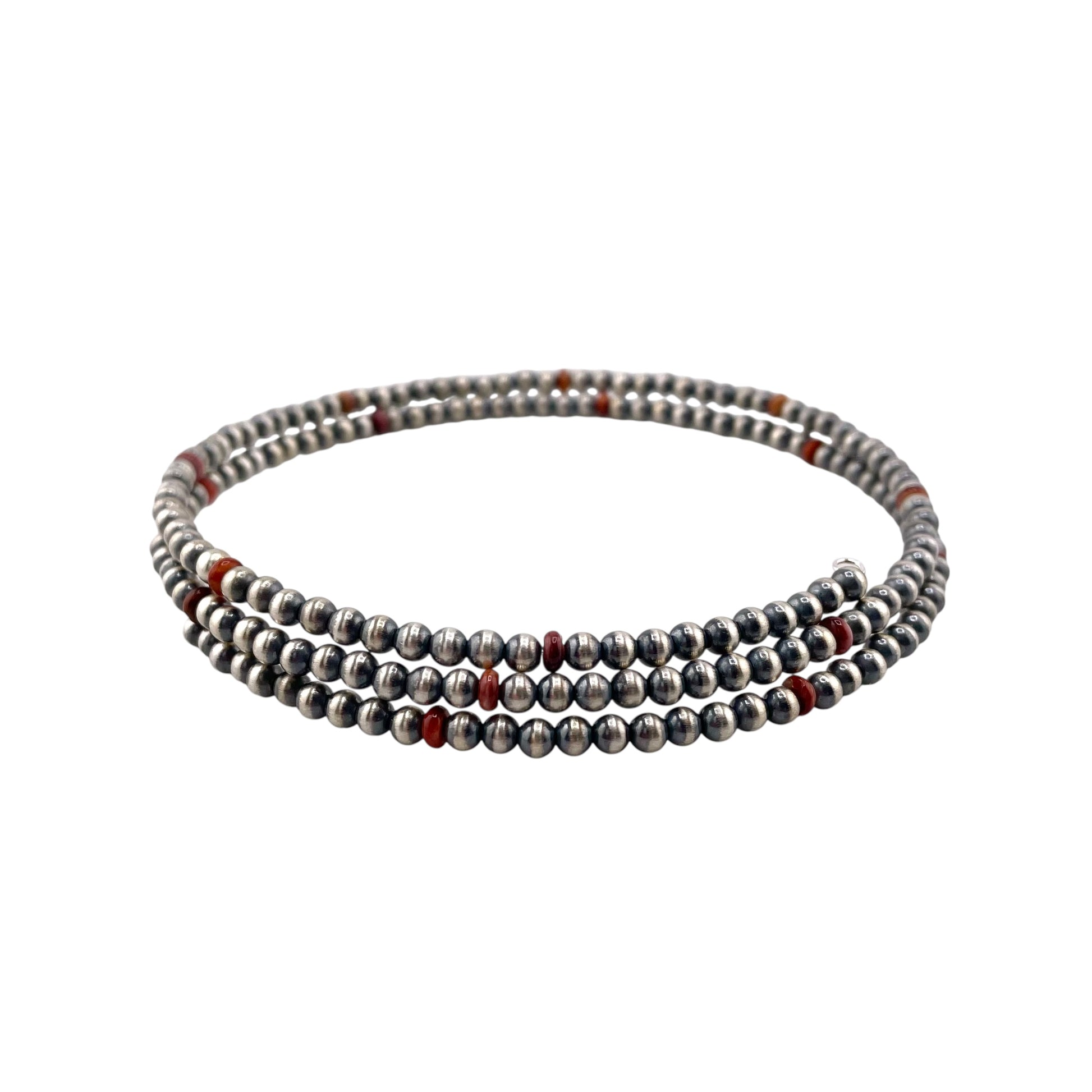 Red Spiny Oyster Desert Pearls 4mm Bead Wrap Necklace Sterling Silver. Necklace is a one-size-fits-all memory wrap necklace.