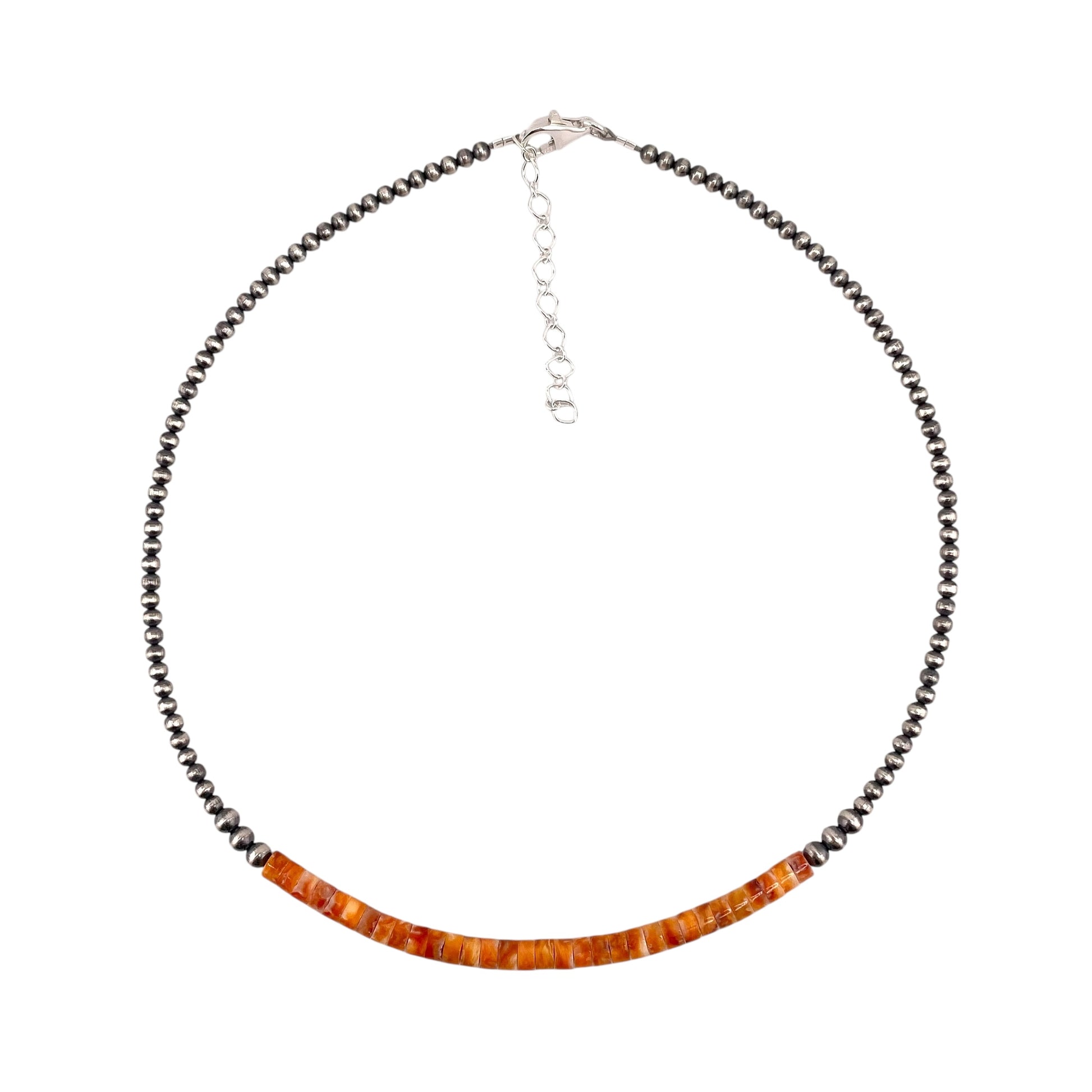 Spiny Oyster Desert Pearl Necklace Sterling Silver. It is 16" long with a 2" extender and 4mm wide at the widest point.