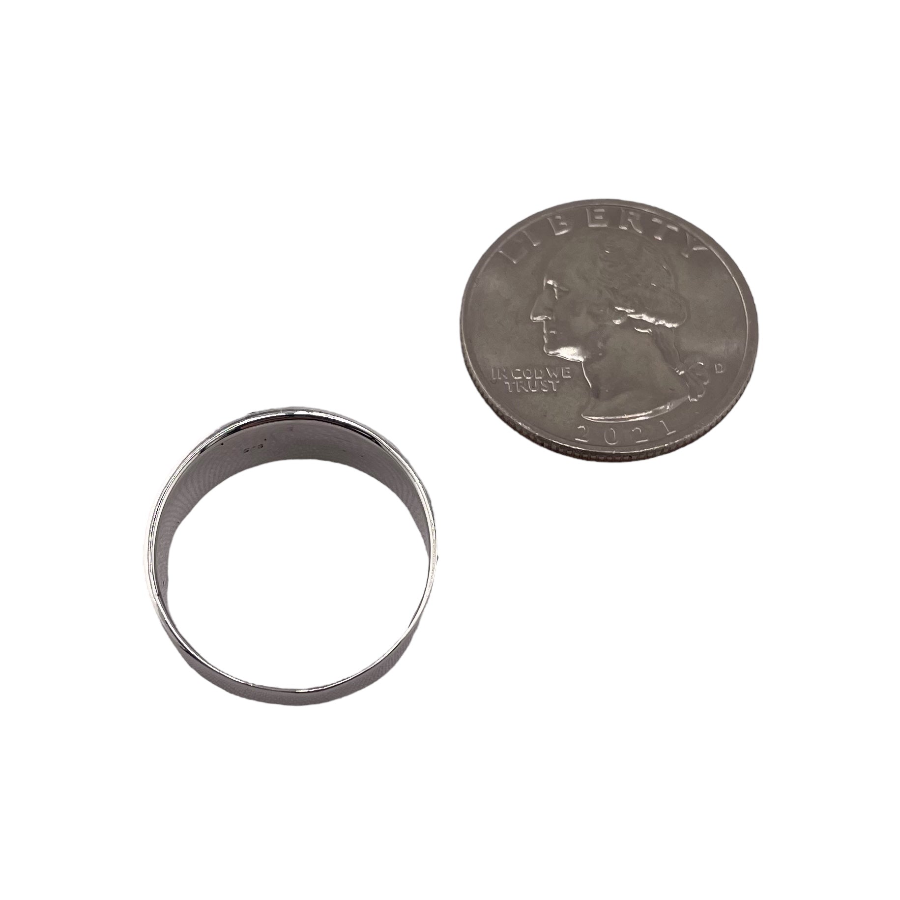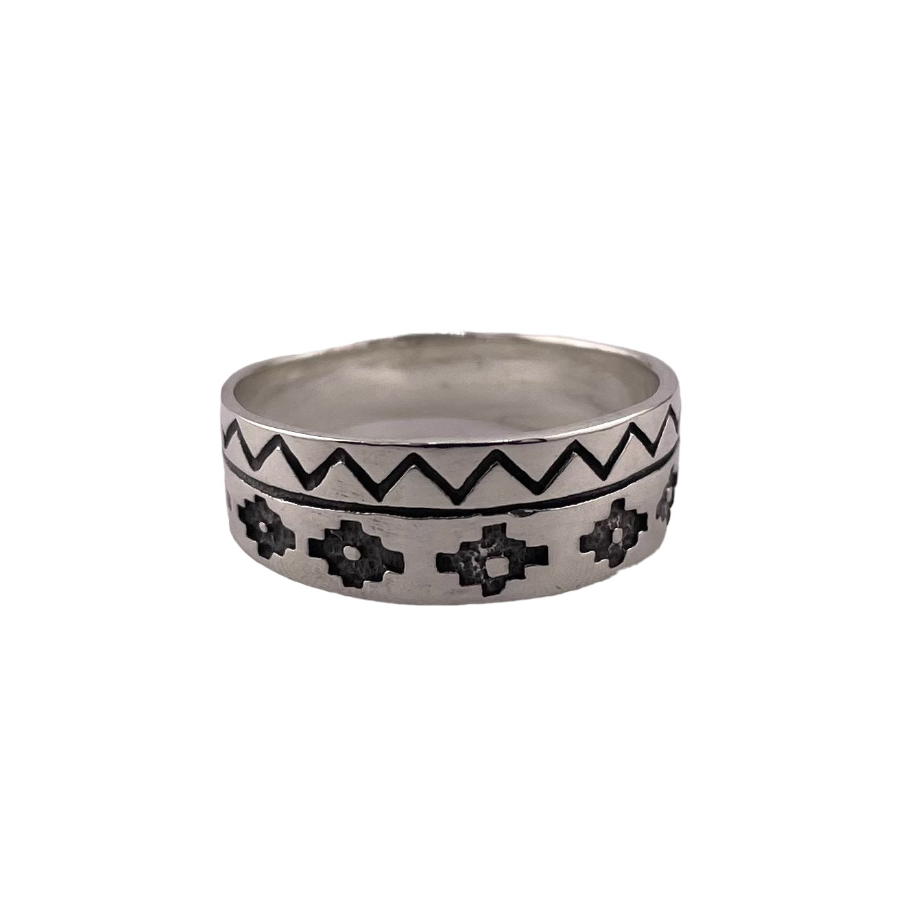Stamped Pattern 7.5mm Band Ring Sterling Silver. This ring measures 7.5mm wide. It is available in sizes 7-10.