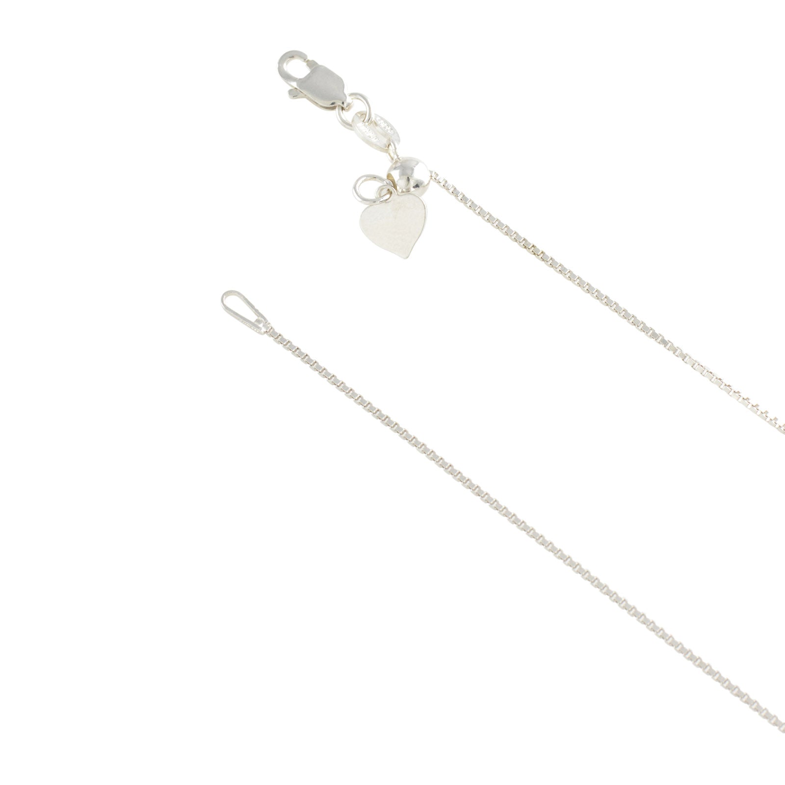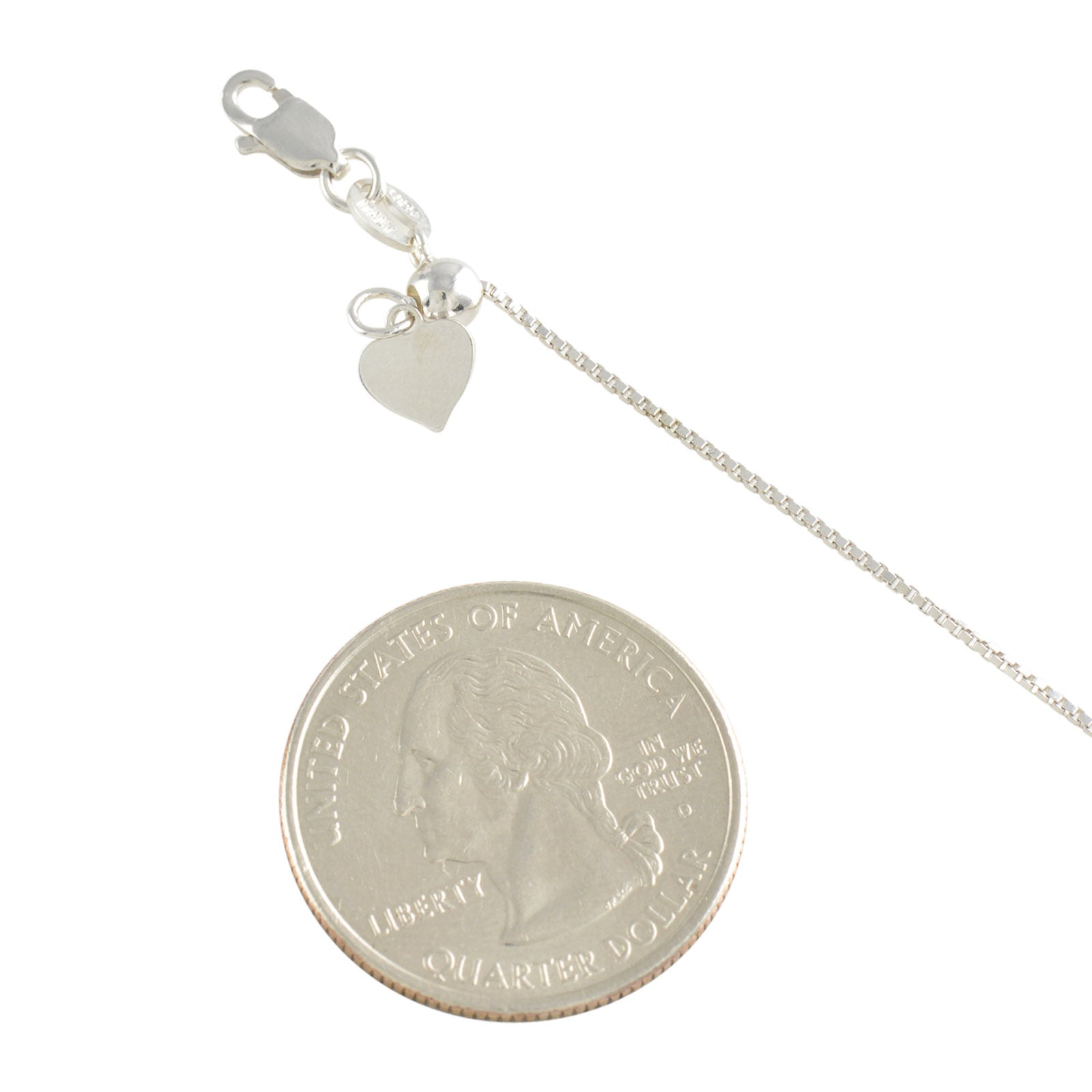 Sterling Silver Box 0.9mm Adjustable Chain. Made in Italy. Measures 22 inches at the longest, and can be adjusted to shorter lengths.