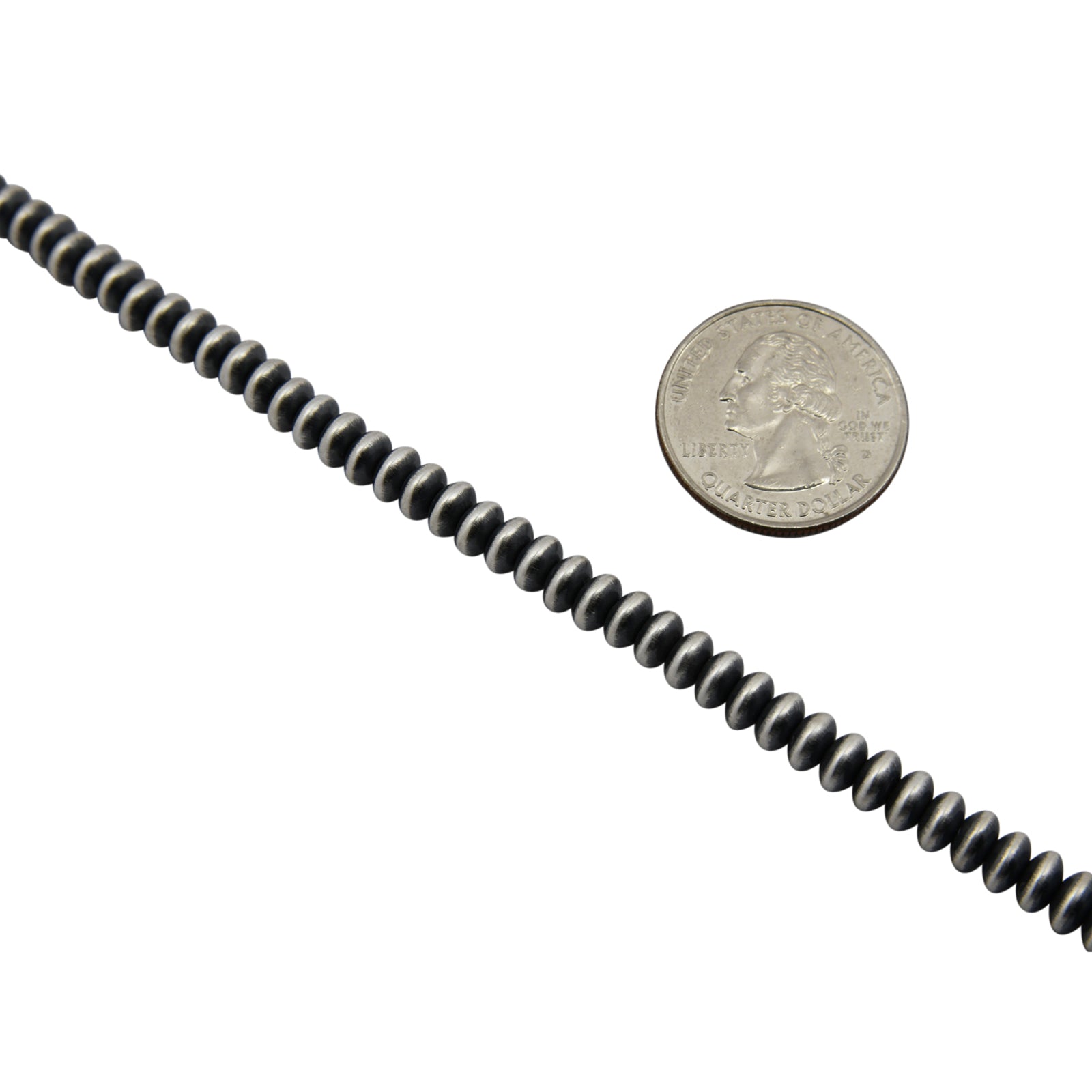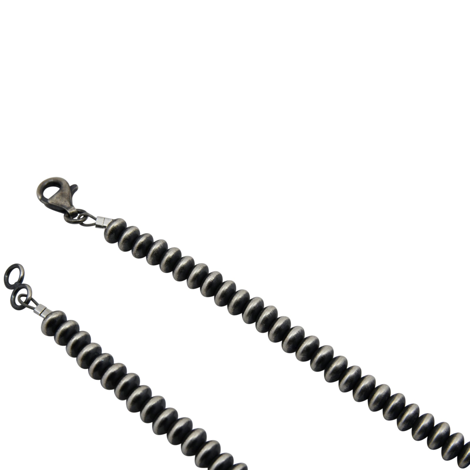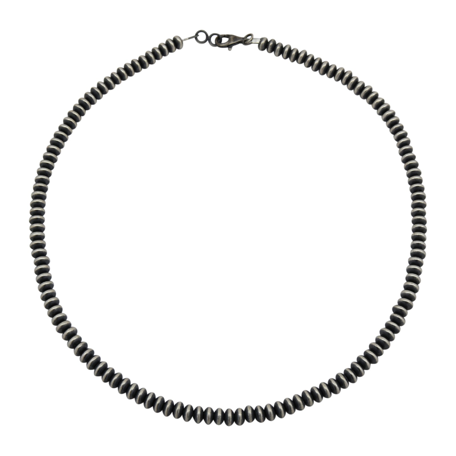 Sterling Silver Navajo Pearl 5.5mm Rondelle Oxidized Bead Necklace. Also known as Santa Fe Pearls or Desert Pearls. The artist hand strung a single strand of 5.5mm silver beads.