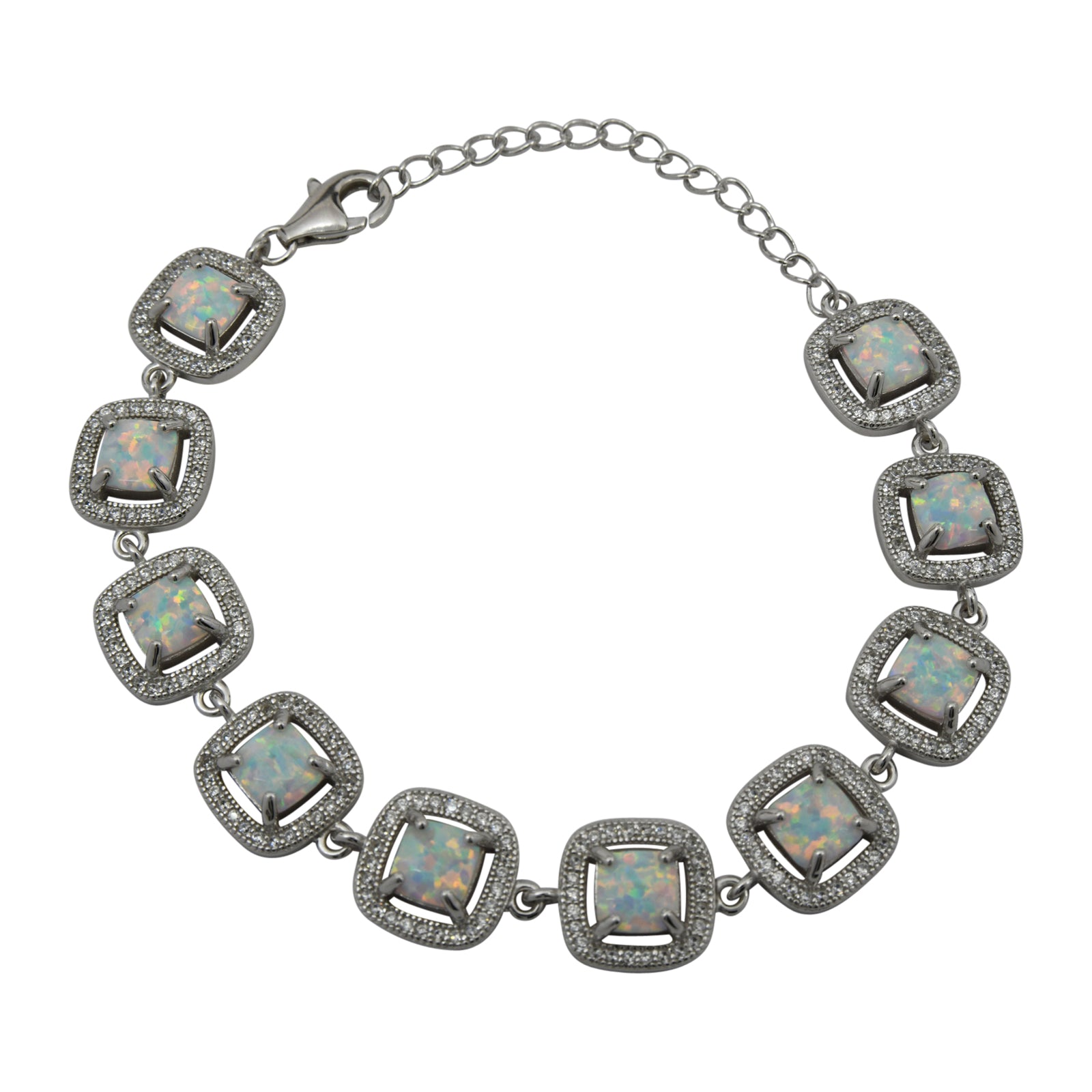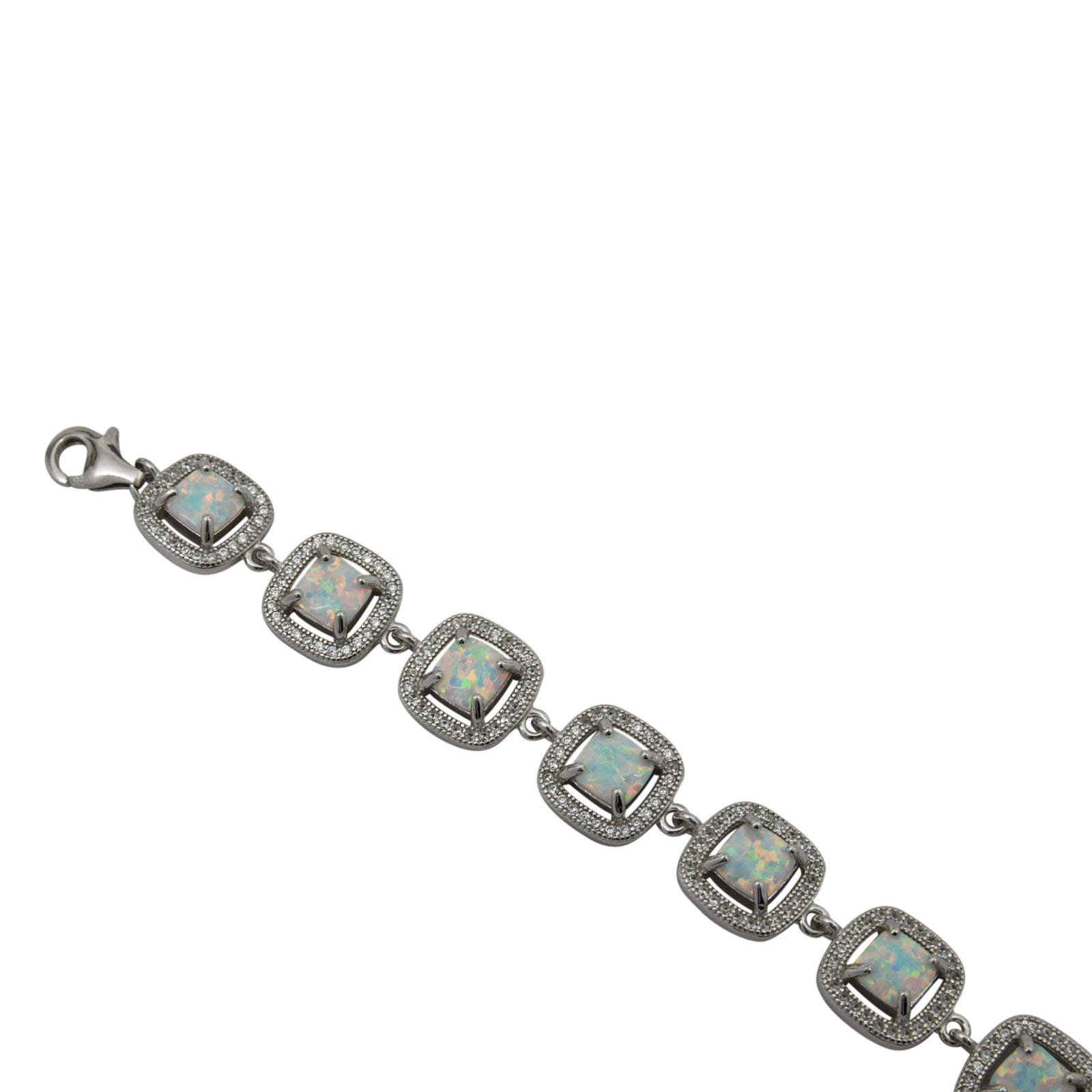 Sterling Silver White Lab Opal & CZ Square Link Tennis Bracelet