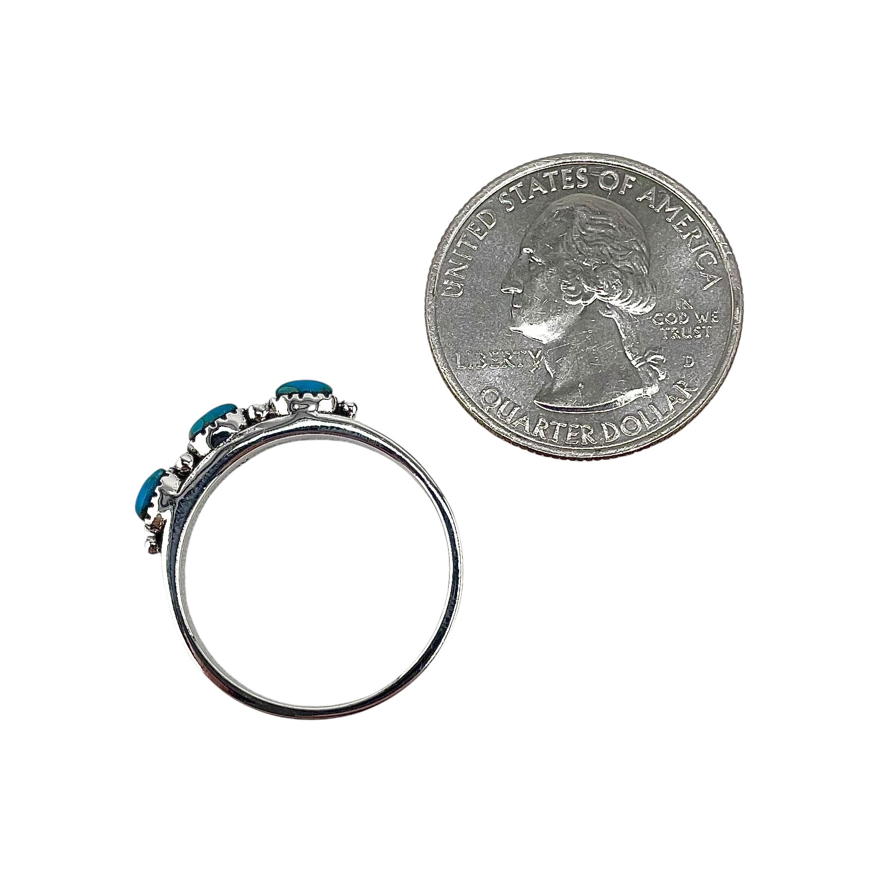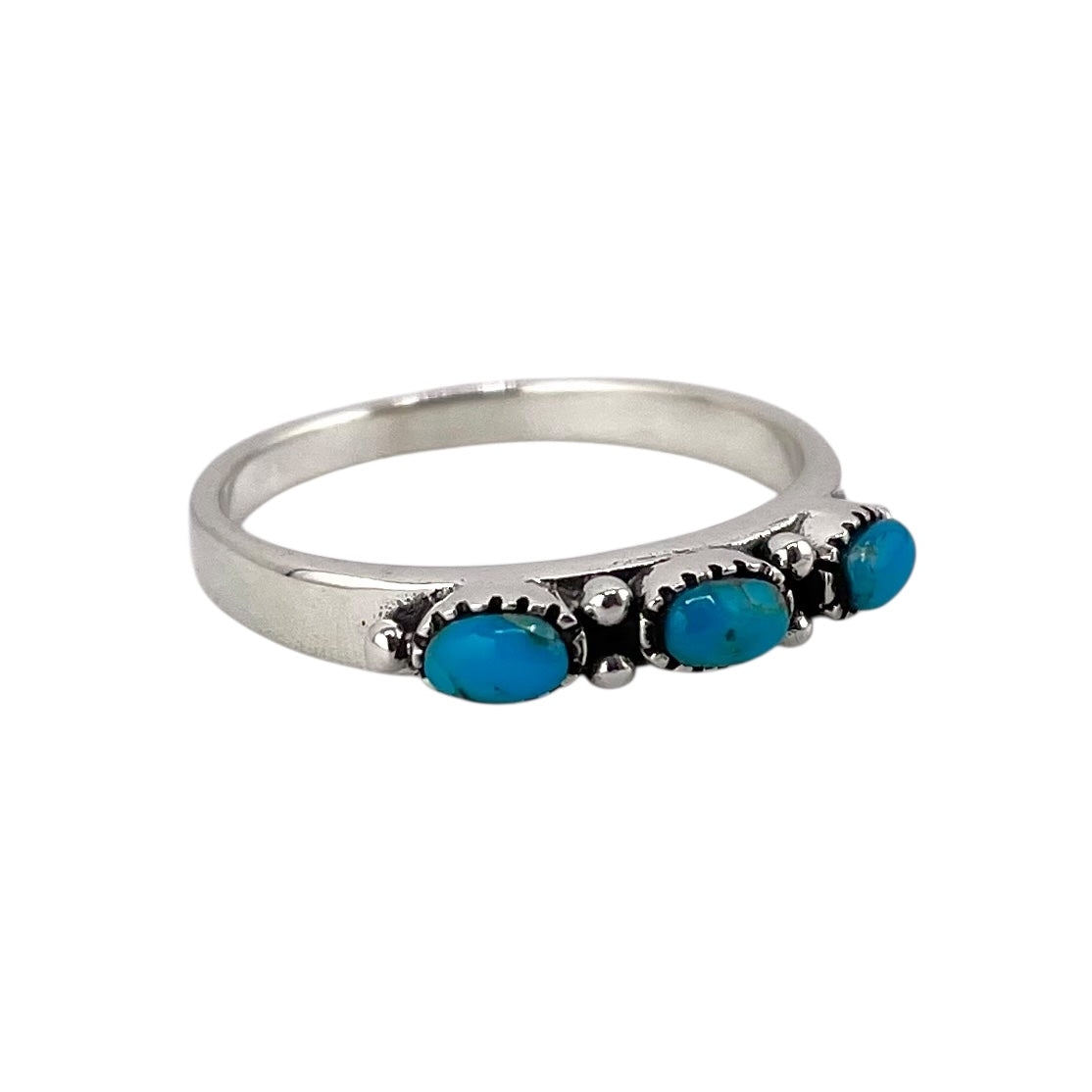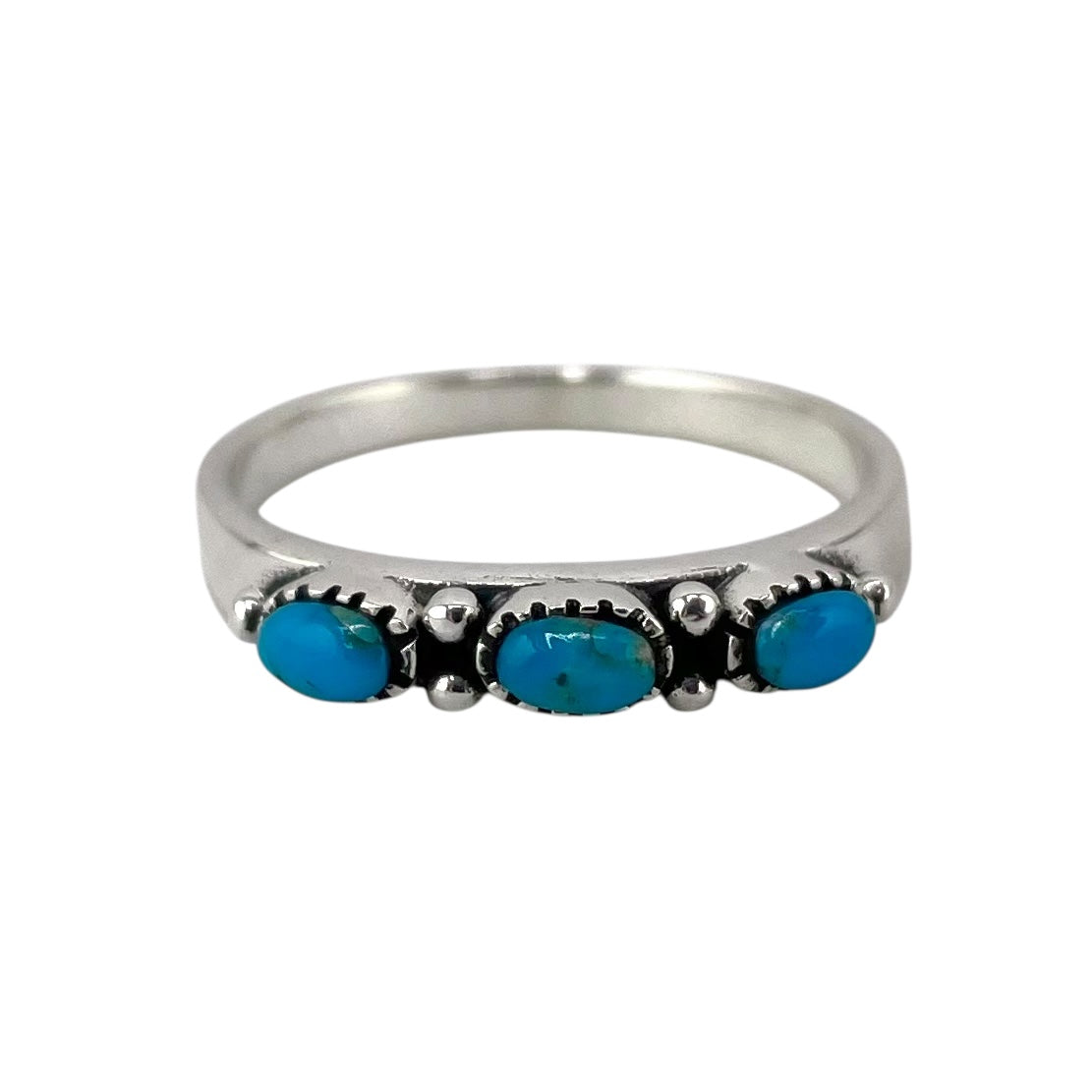 Turquoise 3 Stone Oval Ring Sterling Silver. Ring centerpiece measures 1/8" wide.