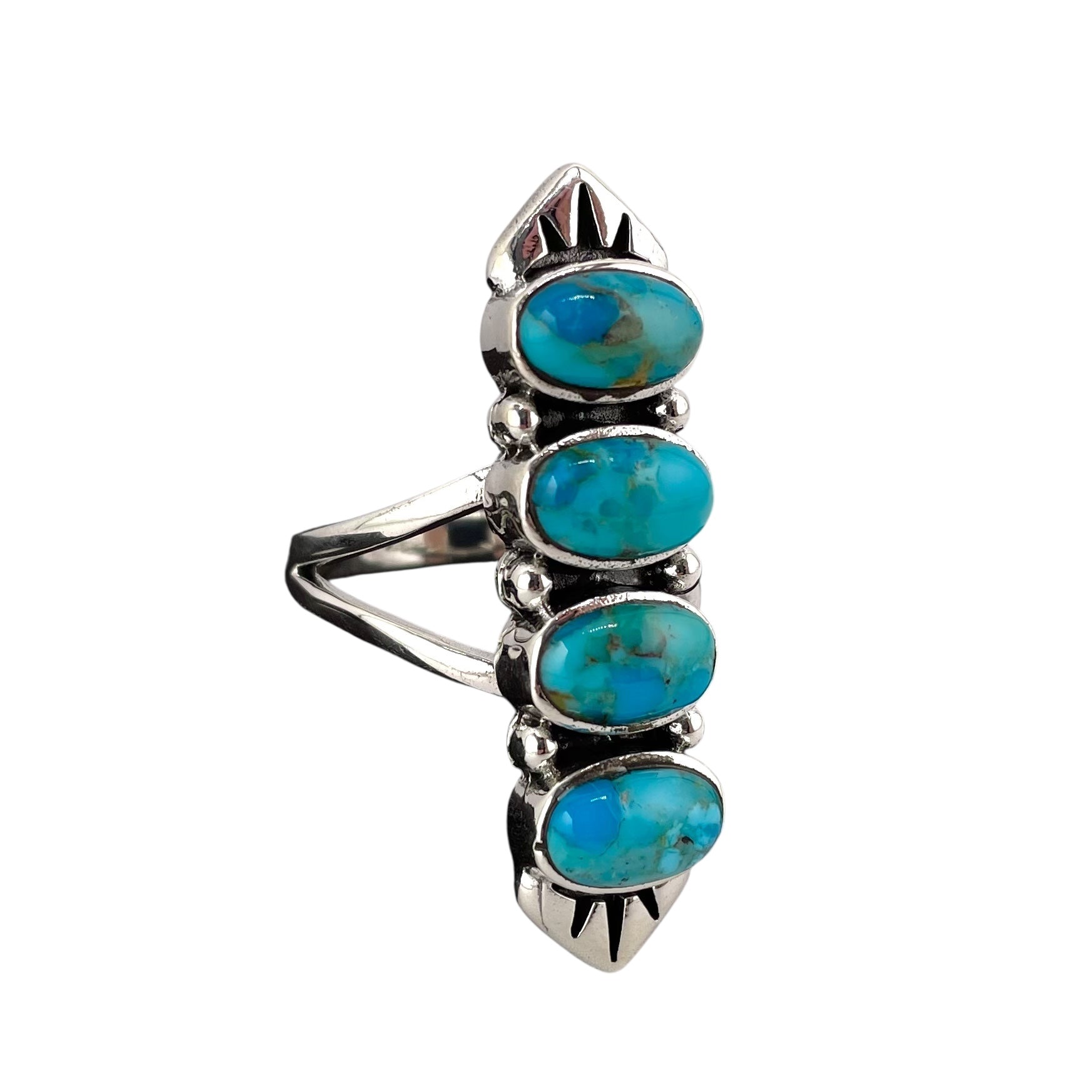 Turquoise 4 Stone Stacked Oval Ring Sterling Silver. Ring centerpiece measures 1-5/8" long by 7/16" wide.