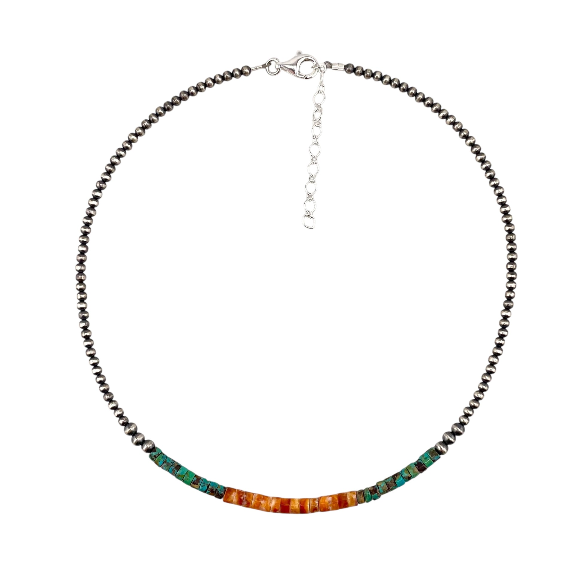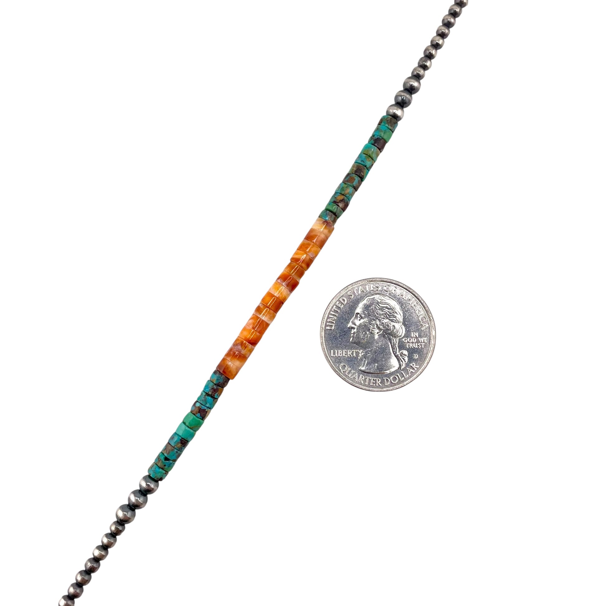 Turquoise & Spiny Oyster Desert Pearl Necklace Sterling Silver. It is 16" long with a 2" extender and 4mm wide at the widest point.