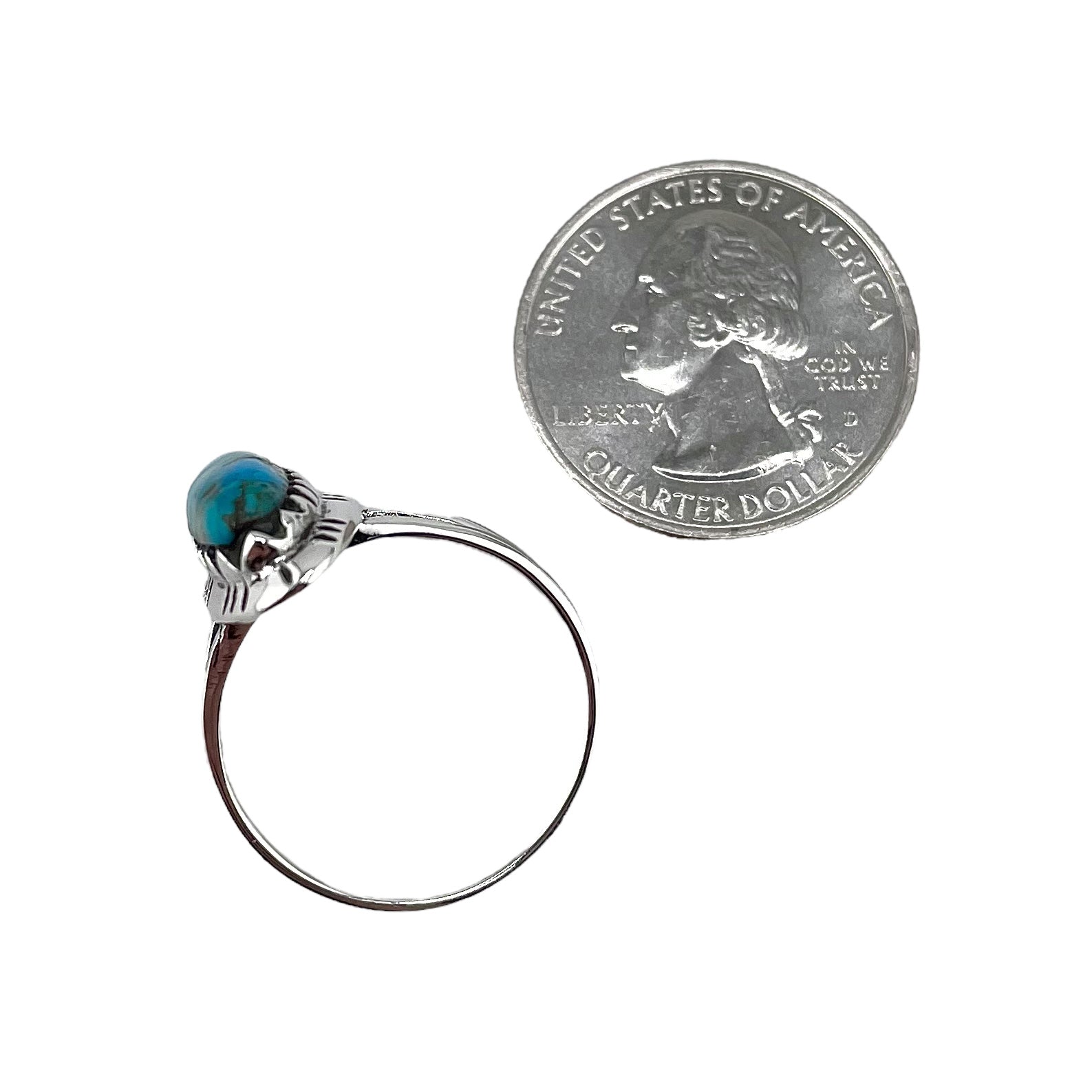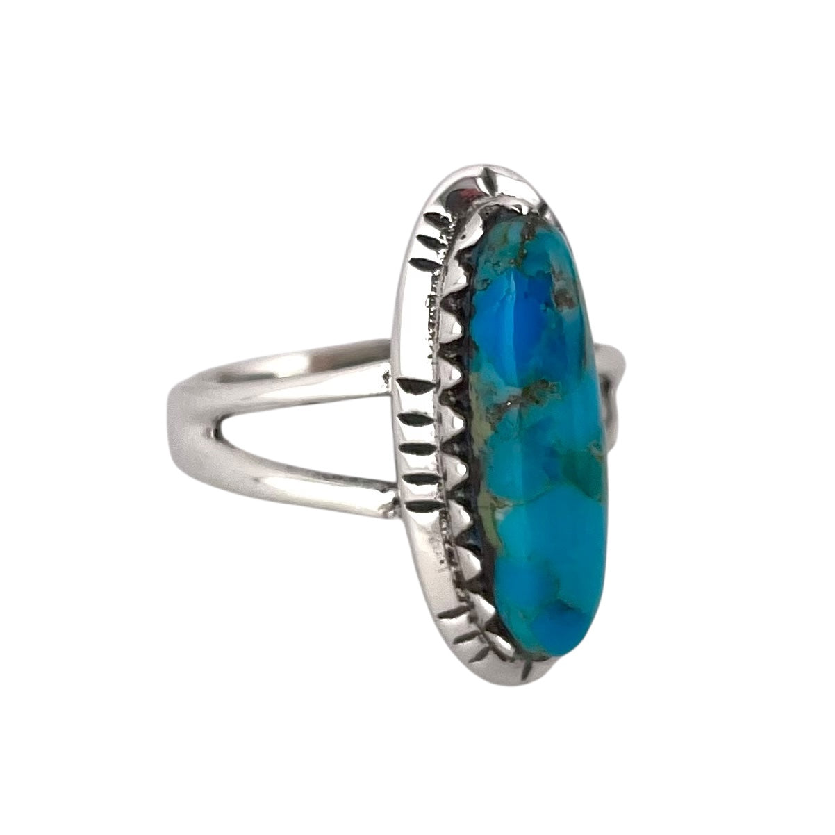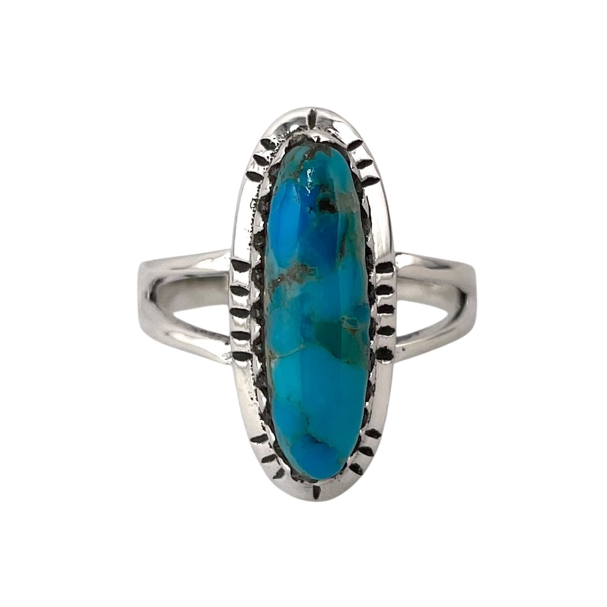 Turquoise Stone Oval Ring Sterling Silver. Ring centerpiece measures 1" long by 5/16" wide.