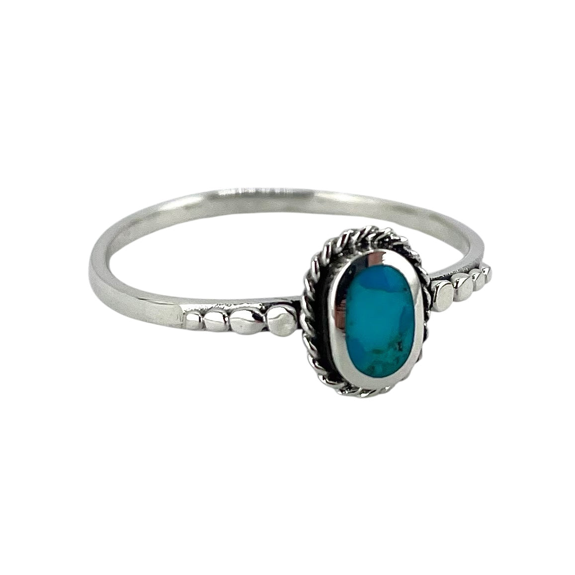 Turquoise Stone Oval Rope Ring Sterling Silver. Ring centerpiece measures 3/8" long and 1/4" wide.