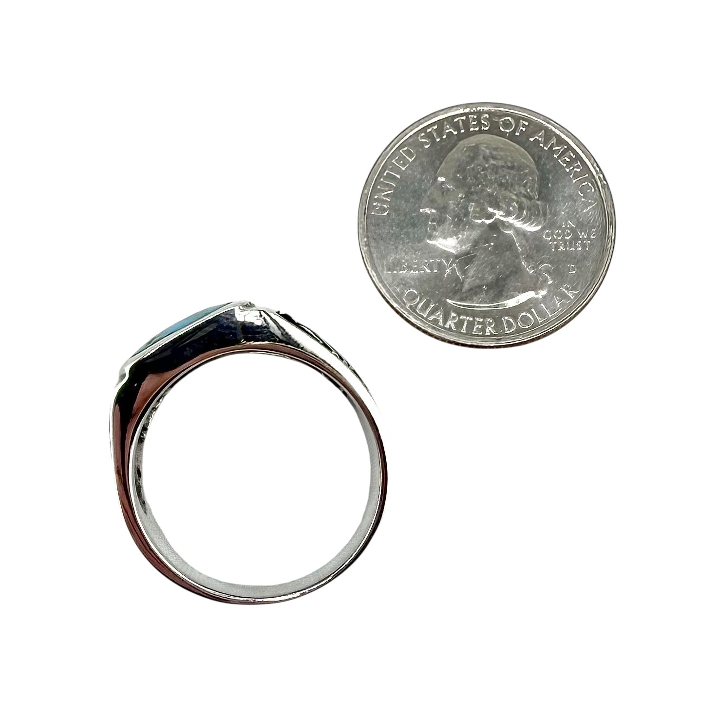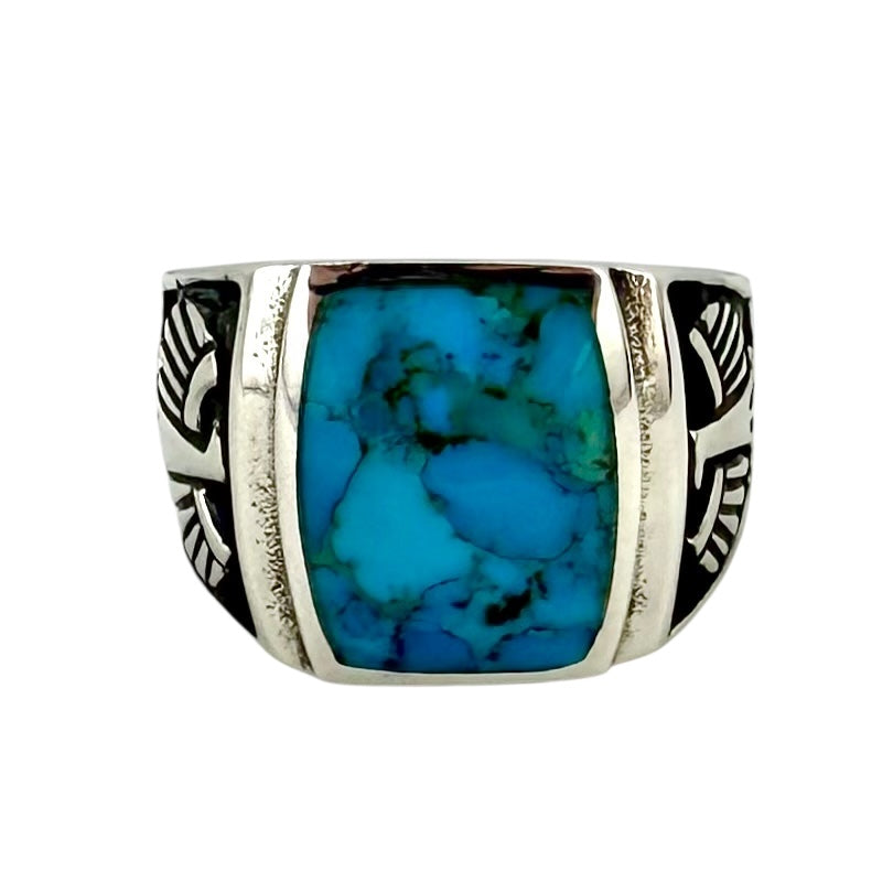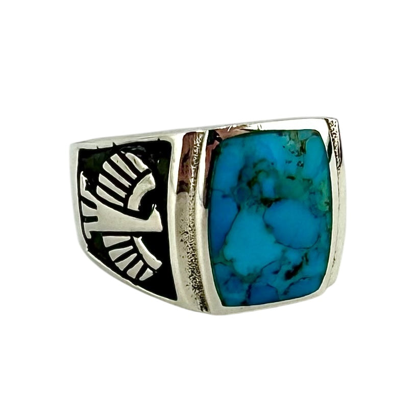 Turquoise Stone Thunderbird Mens Ring Sterling Silver. This ring measures 5/8" wide and is available in sizes 8-12.