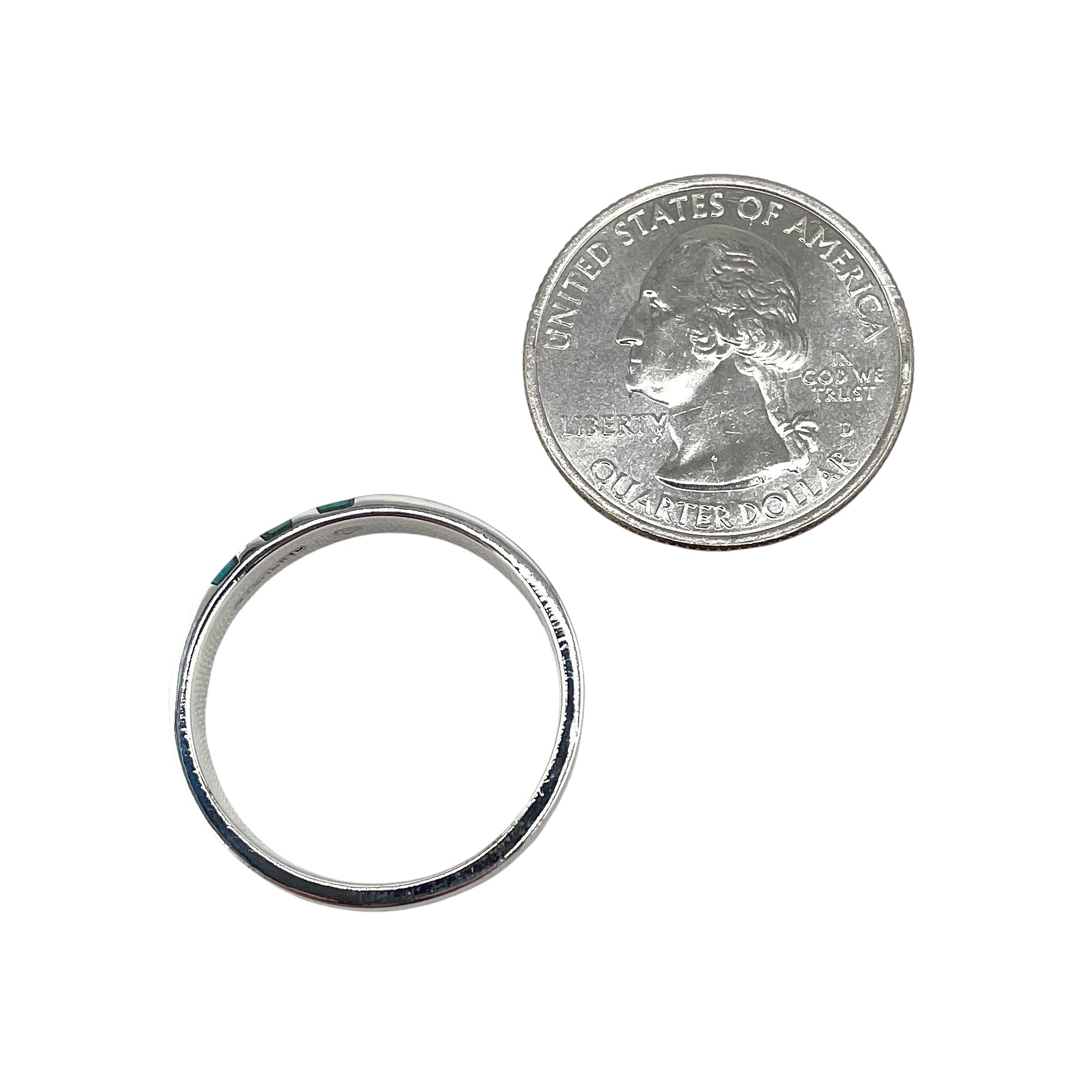 Turquoise 3 Stone Band Ring Sterling Silver. Ring measures 3/16" wide and is available in sizes 8-12.