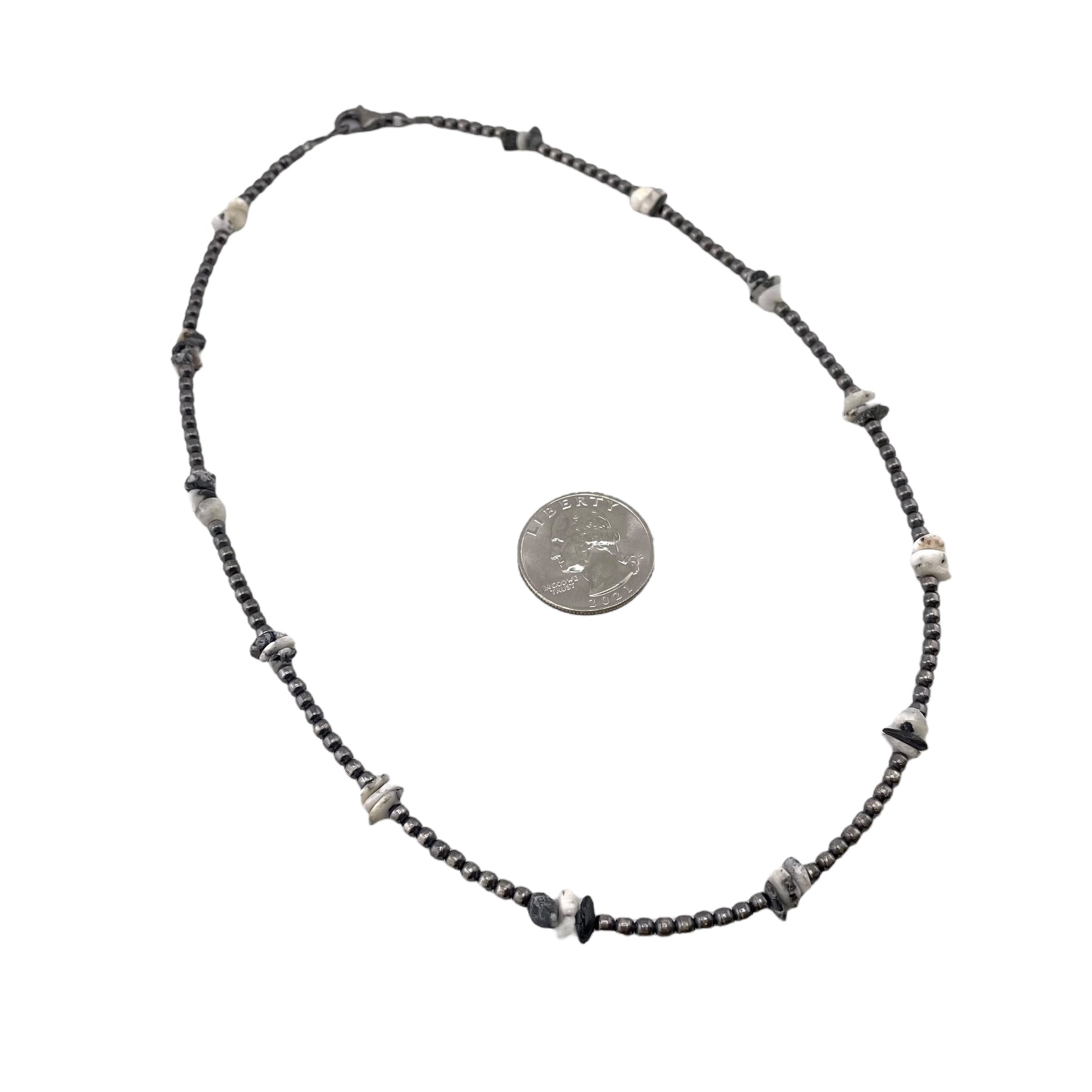 White Buffalo Chip Desert Pearls Bead Necklace Sterling Silver. Necklace is 18" long with 3mm silver beads. It is 1/4" at the widest point.