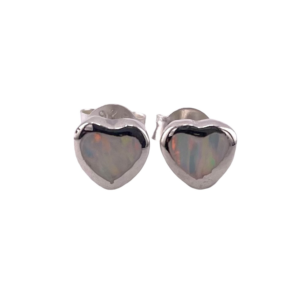 White Lab Opal Heart Stud Earrings Sterling Silver
