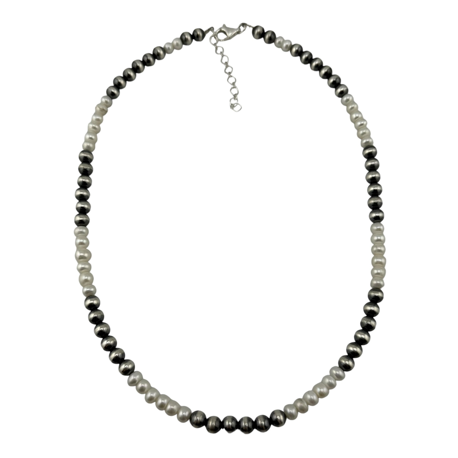 White Pearl Navajo Pearl 6mm Bead 18" Necklace Sterling Silver. Necklace is 18" long with a 2" extender and 6mm silver beads. It is 1/4" at the widest point.
